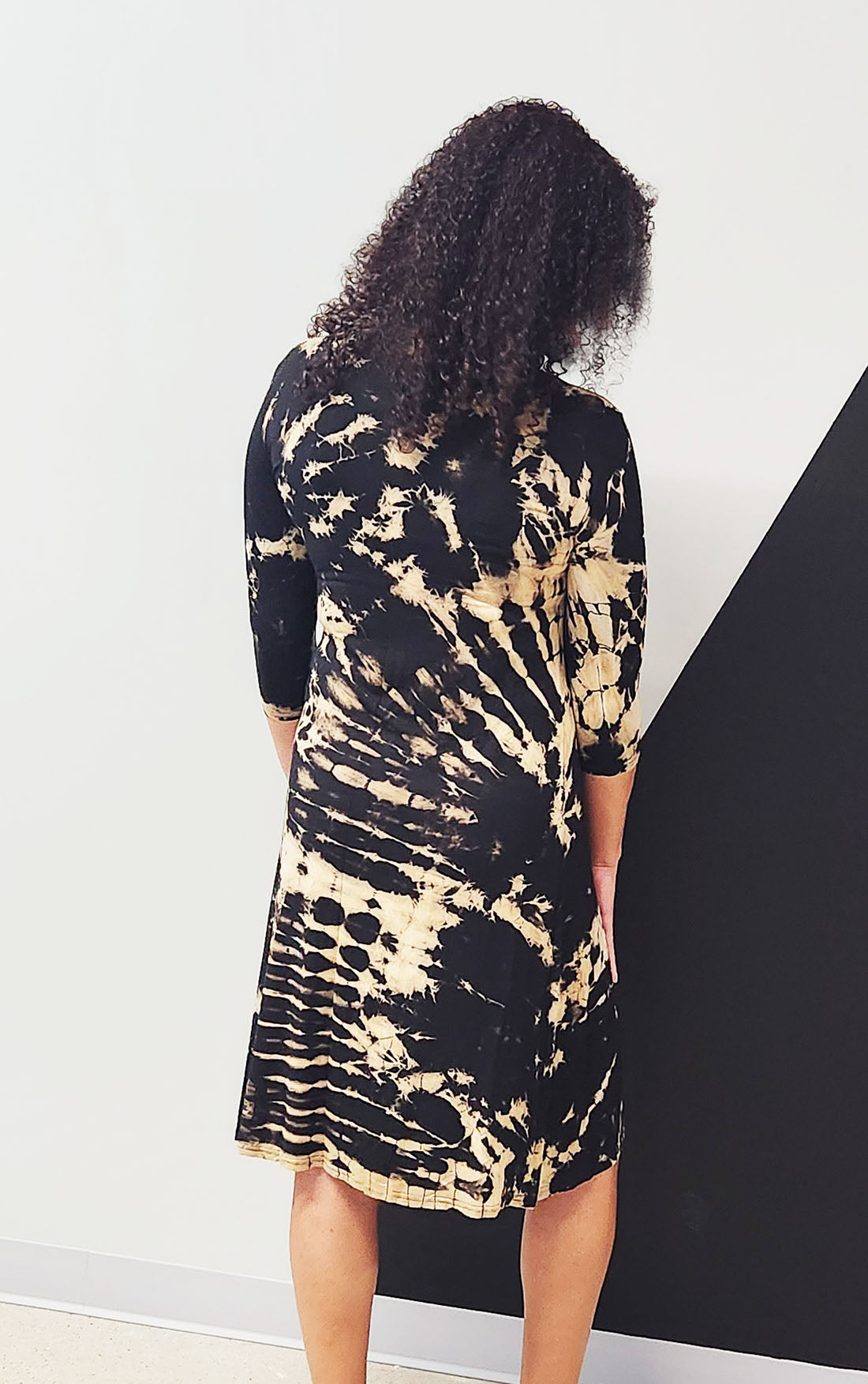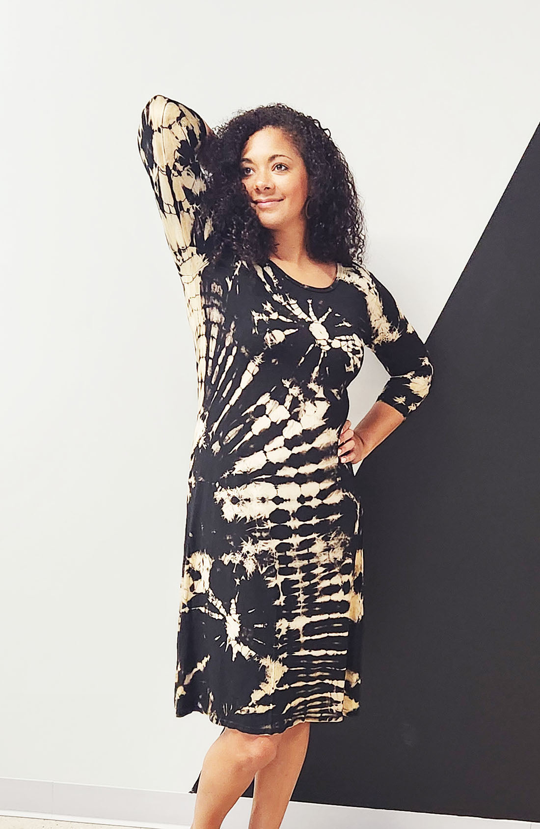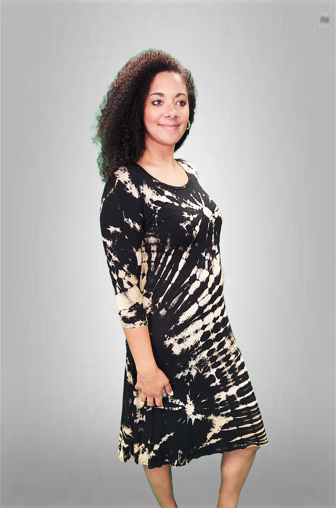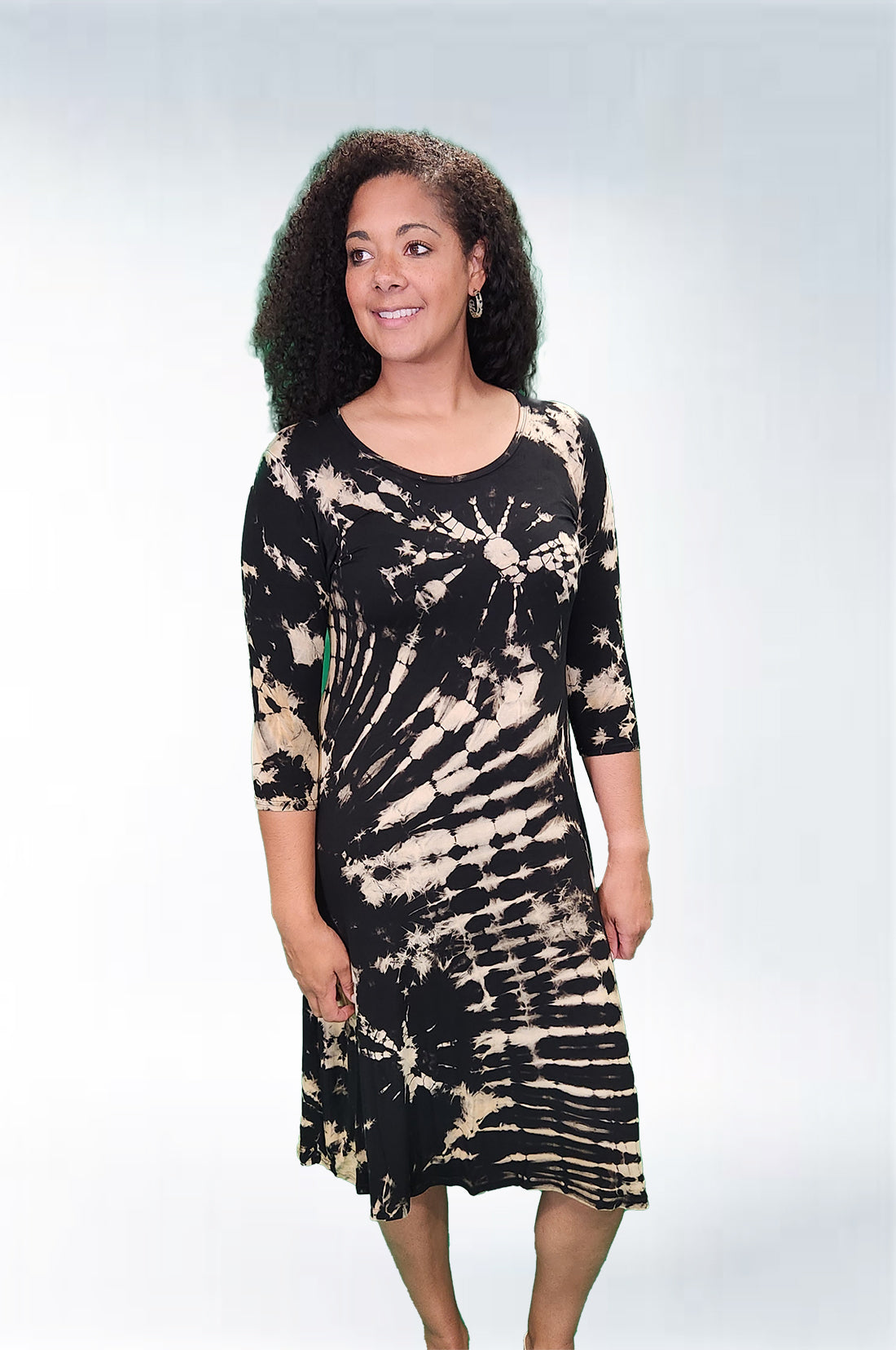 The perfect little black dress! This fabric is so comfortable you can wear it anytime of year. The perfect base for beautiful jackets, scarves, jewelry, etc. The hem comes to a little below the calf. The model is 5' 7" and is wearing Small/Medium. Small/Medium fits sizes 8 to 12. Large/X-Large fits sizes 14 to 18.