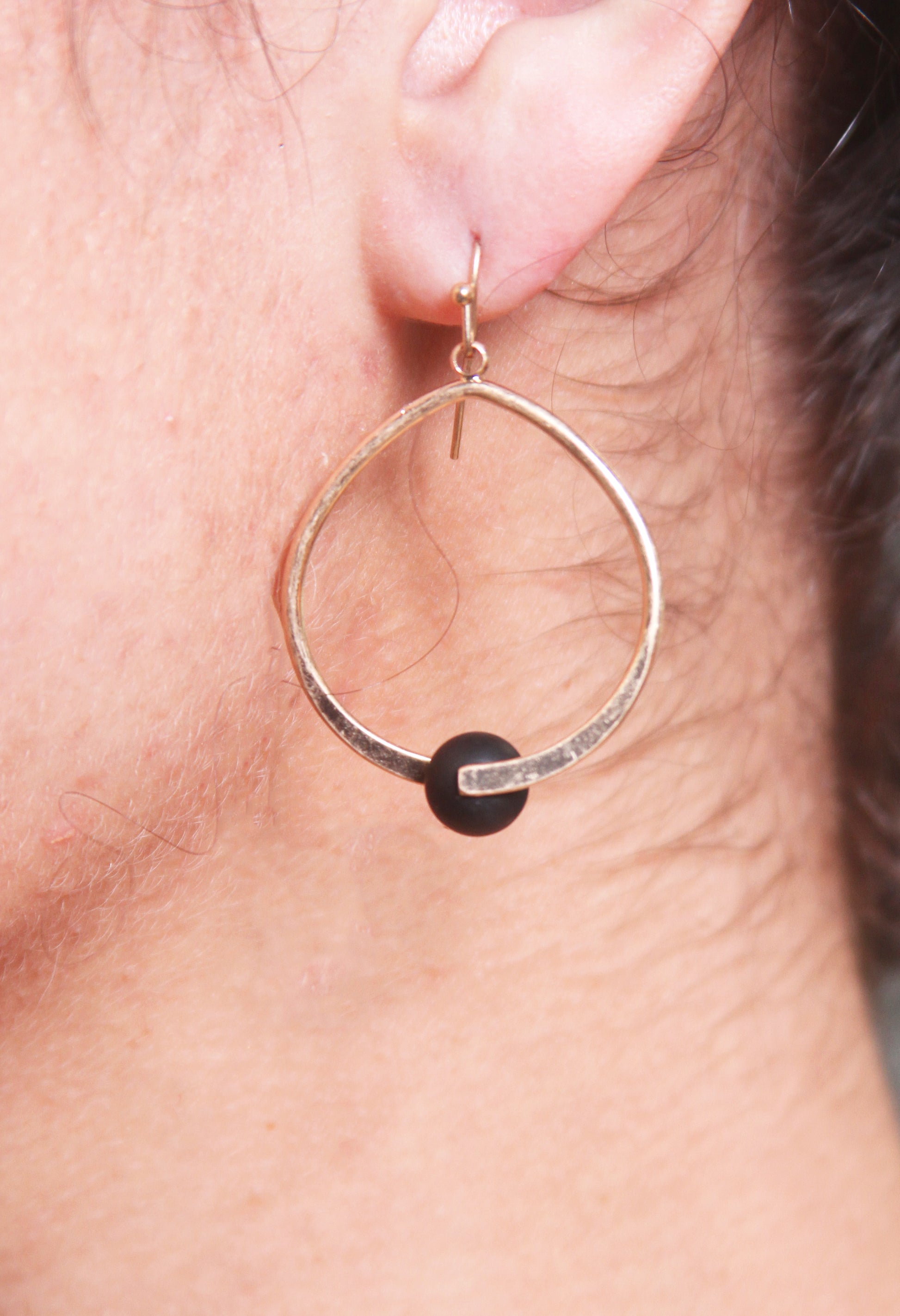 This is a beautiful brass hoop interrupted by a little black bead. 1.5" long.