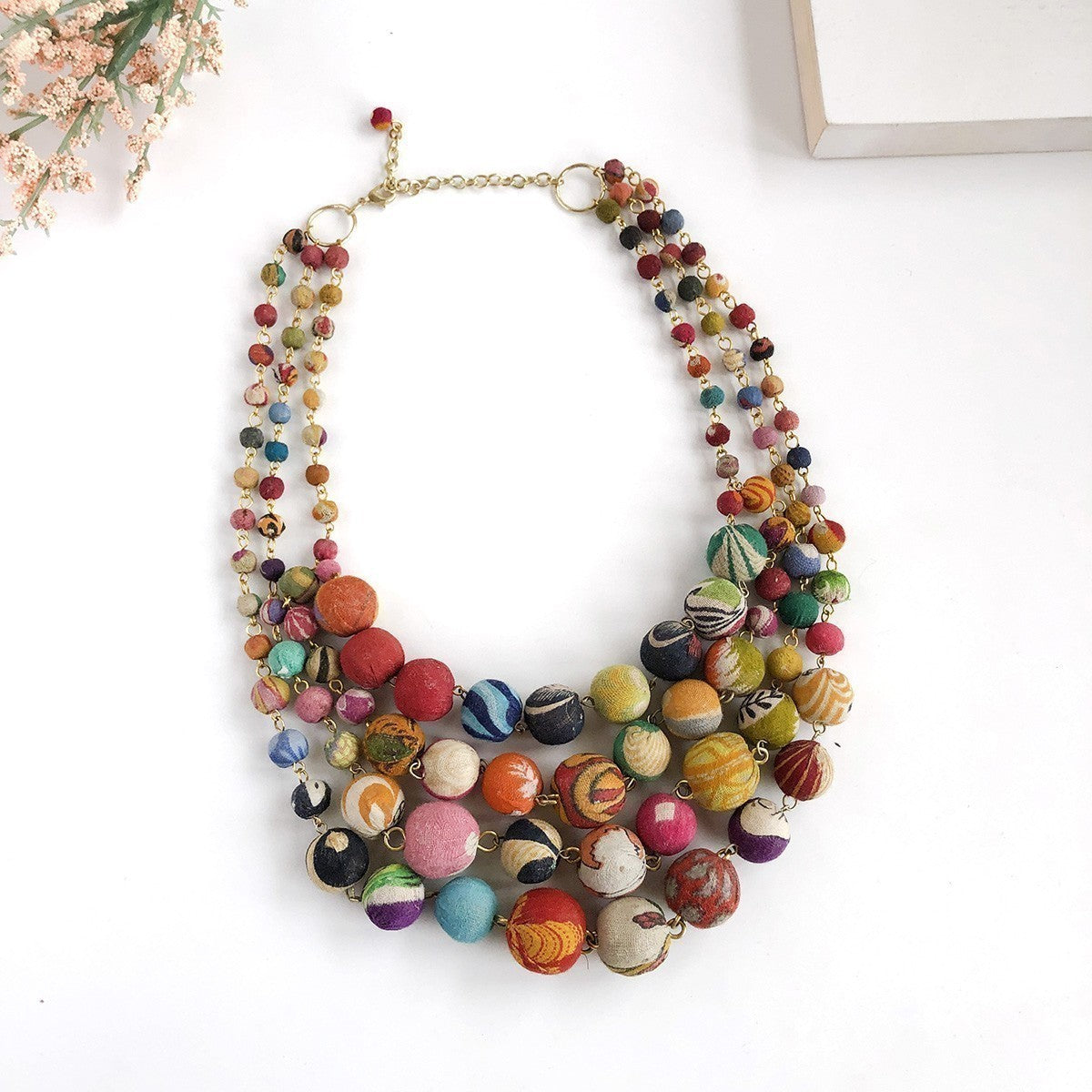 Each piece is made from recycled Kantha textiles, so colors and patterns are all one-of-a-kind and will vary. Measures 16″ long at the shortest strand with a 3″ extender. Sustainably handmade by women artisans in India. Fair Trade