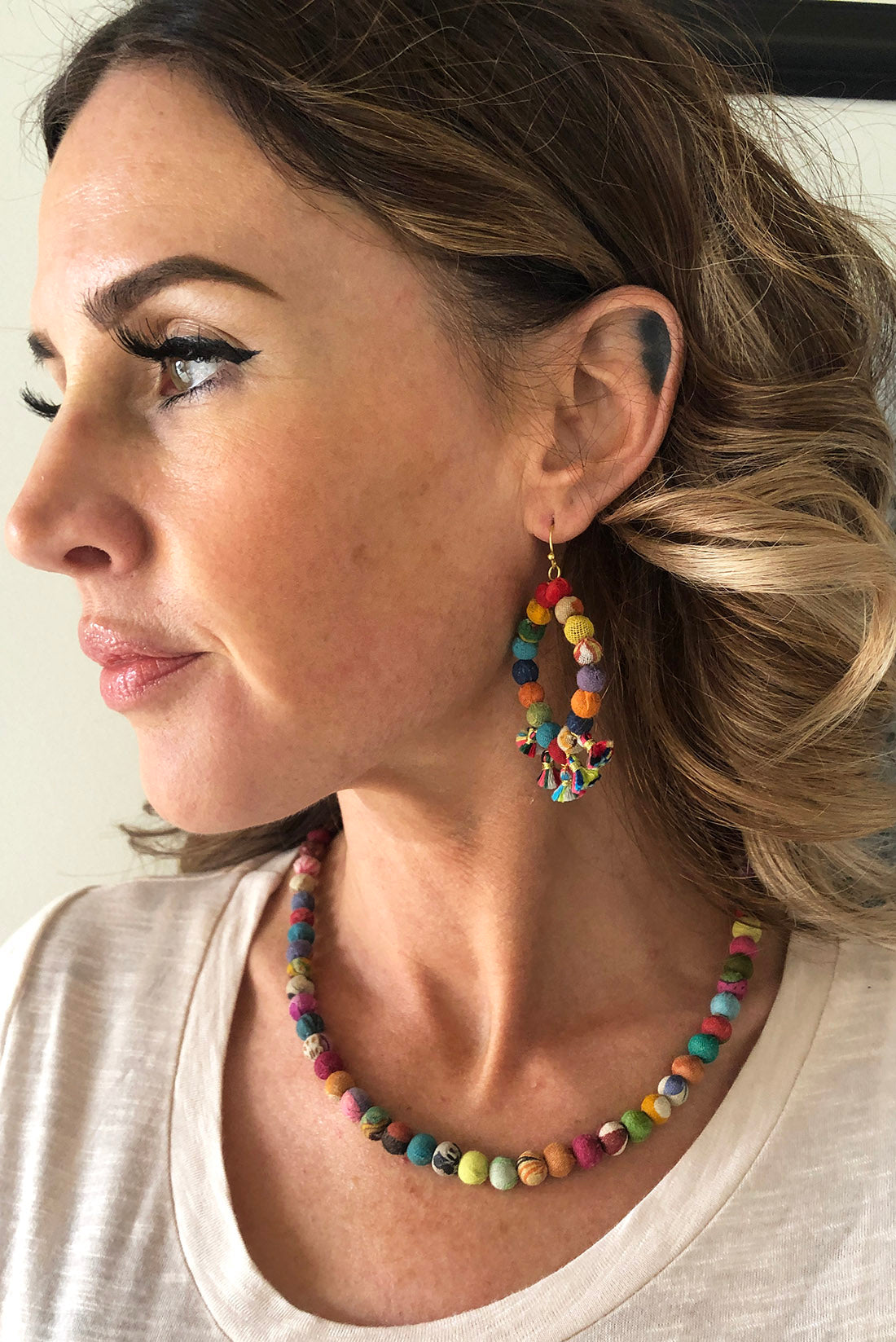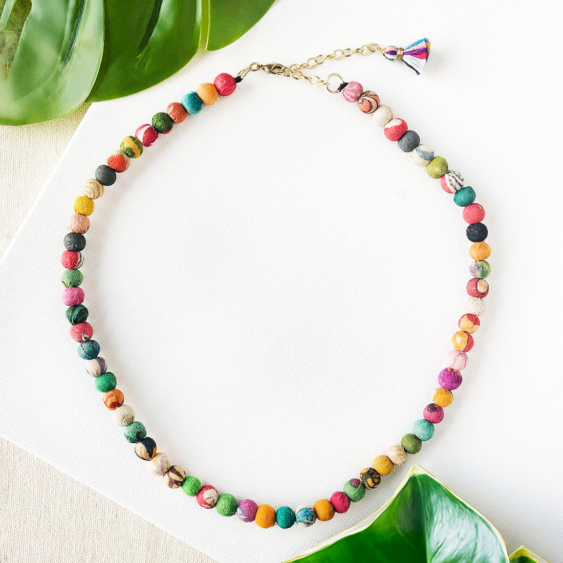 A simple strand of colorful, repurposed Kantha textile beads. This classic piece adds a delicate burst of color to any outfit and can easily be layered with other styles.