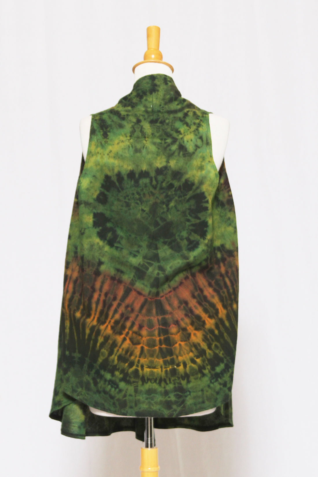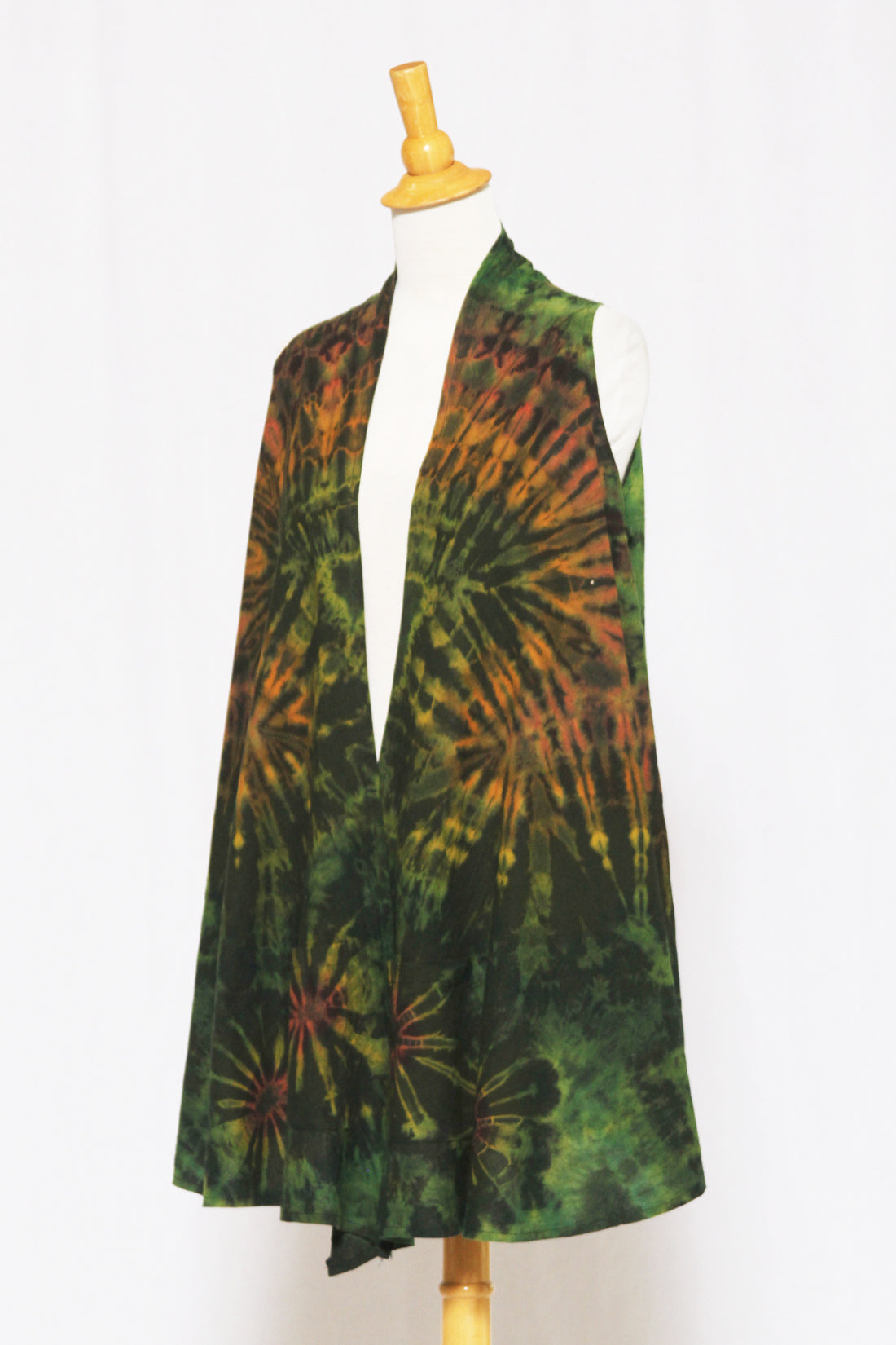 This beautiful tie dyed vest has patch pockets on both sides. The colors will vary but will mainly Green. The placement of designs varies also. 100% cotton. One size fits up to size 18.