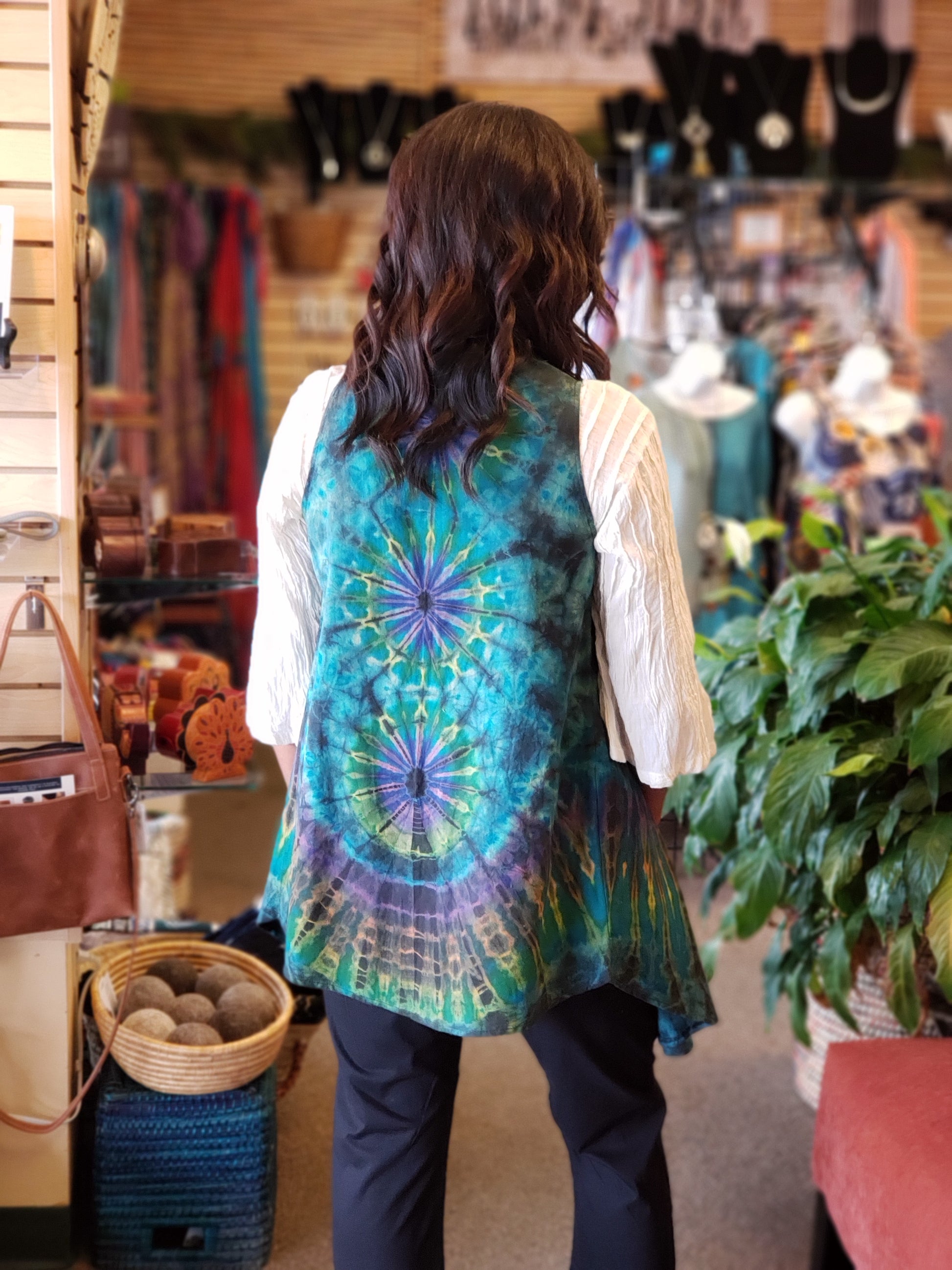 This beautiful tie dyed vest has patch pockets on both sides. The colors will vary but will mainly turquoise. The placement of designs varies also. One size fits up to size 18.