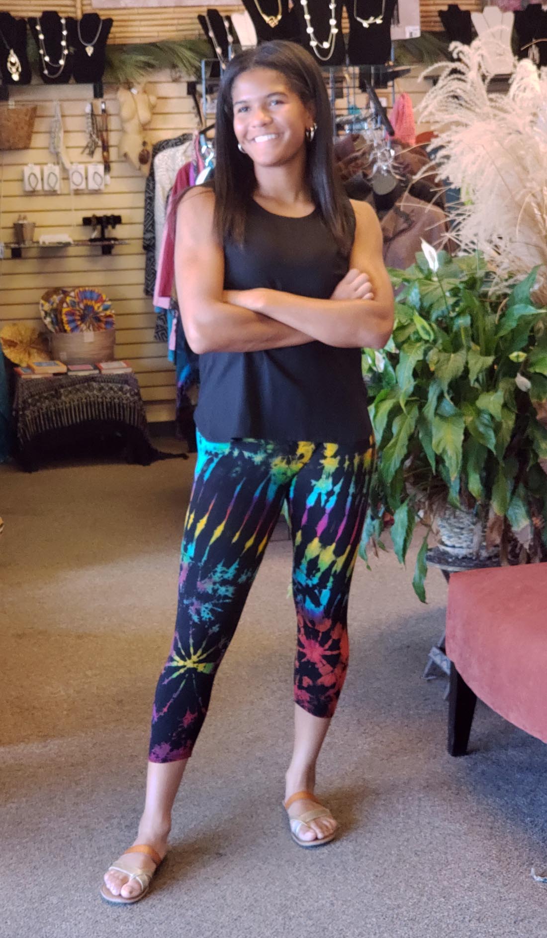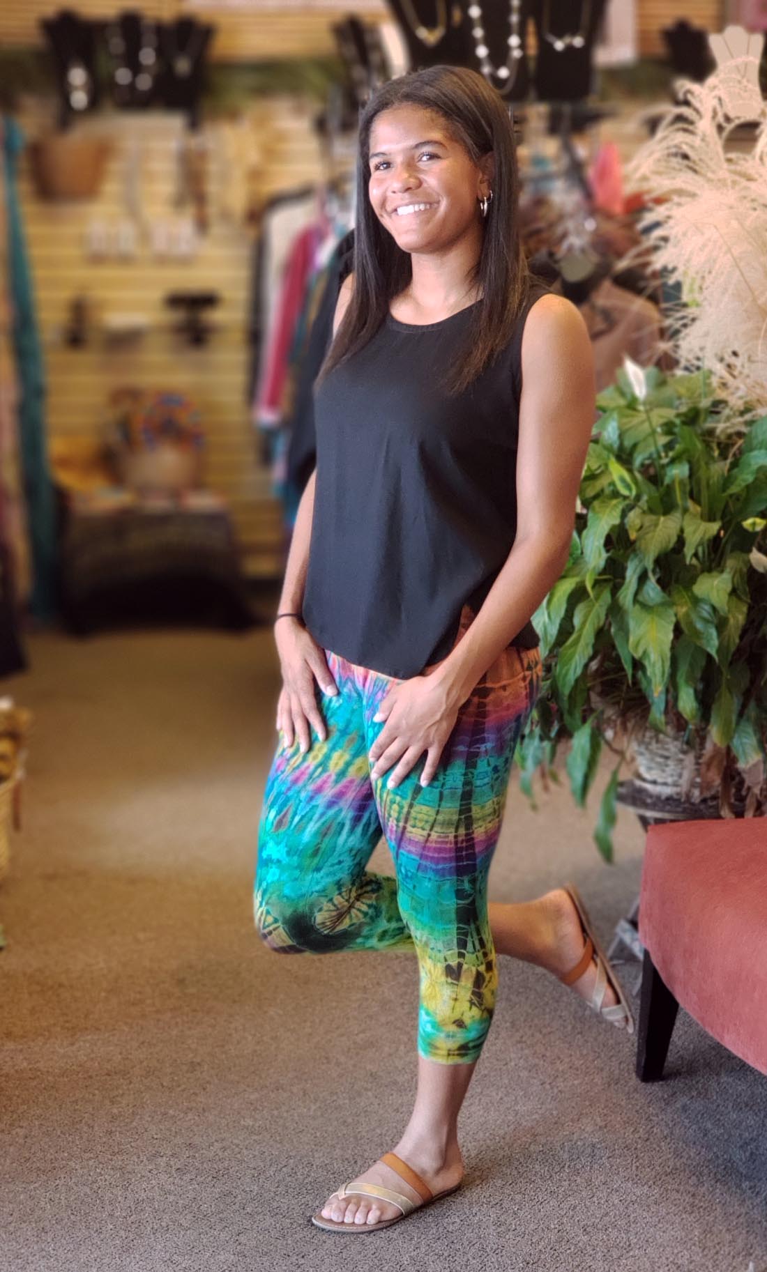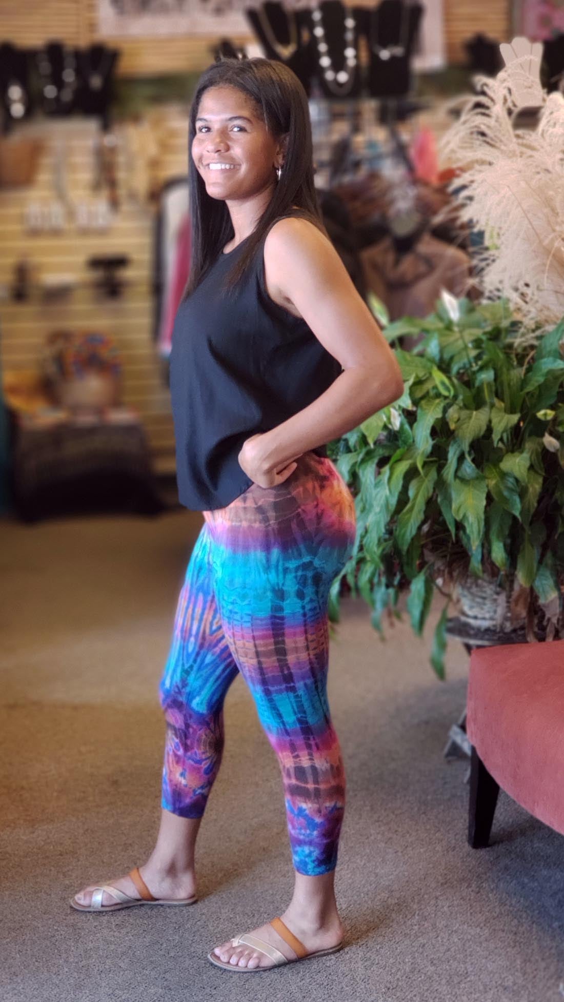 These are perfect leggings for this summer. Wear these cropped tie dye leggings with almost any outfit this summer and be cool, and stylish at the same time. Available in Assorted colors, if there is a certain color you are looking for please call or email us. One size fits most.