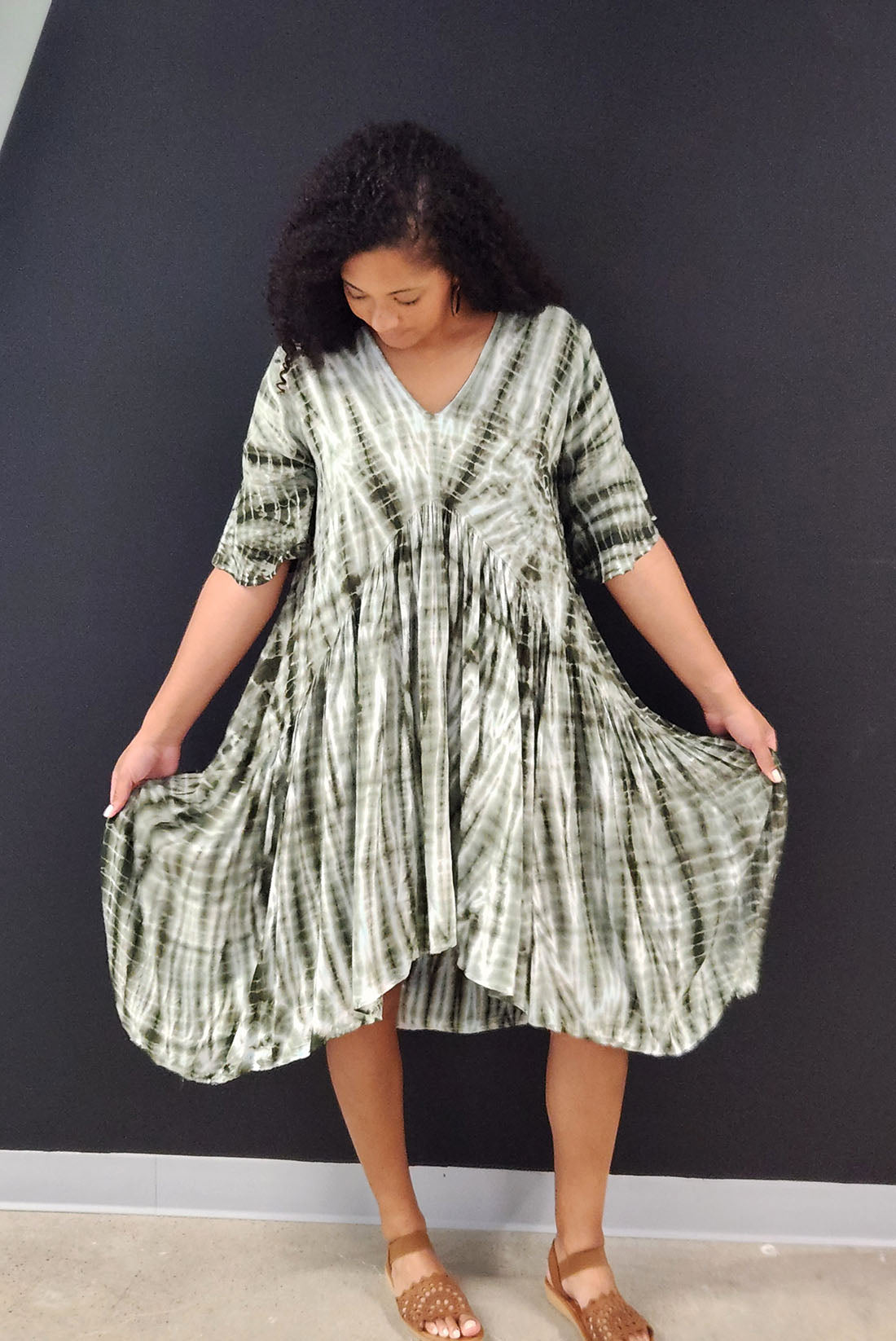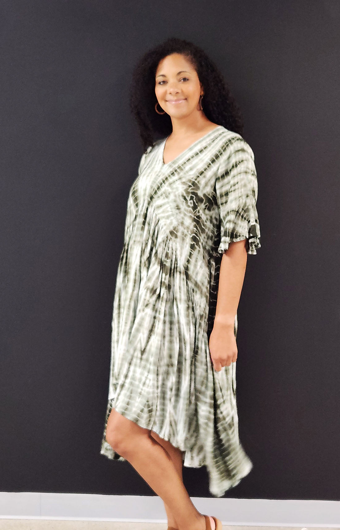 This beautiful tie dye dress is feminine and playful. It has an A-line body with a flirty gathered ruffle around the bottom. The hemline is higher in front just above the knee and falls to mid-calf at the back. The elbow-length sleeve echoes the ruffle. The rayon fabric is light-weight and perfect for warm weather. Cold water wash, dry on low. One size fits sizes 12 to 18. Made in Thailand.