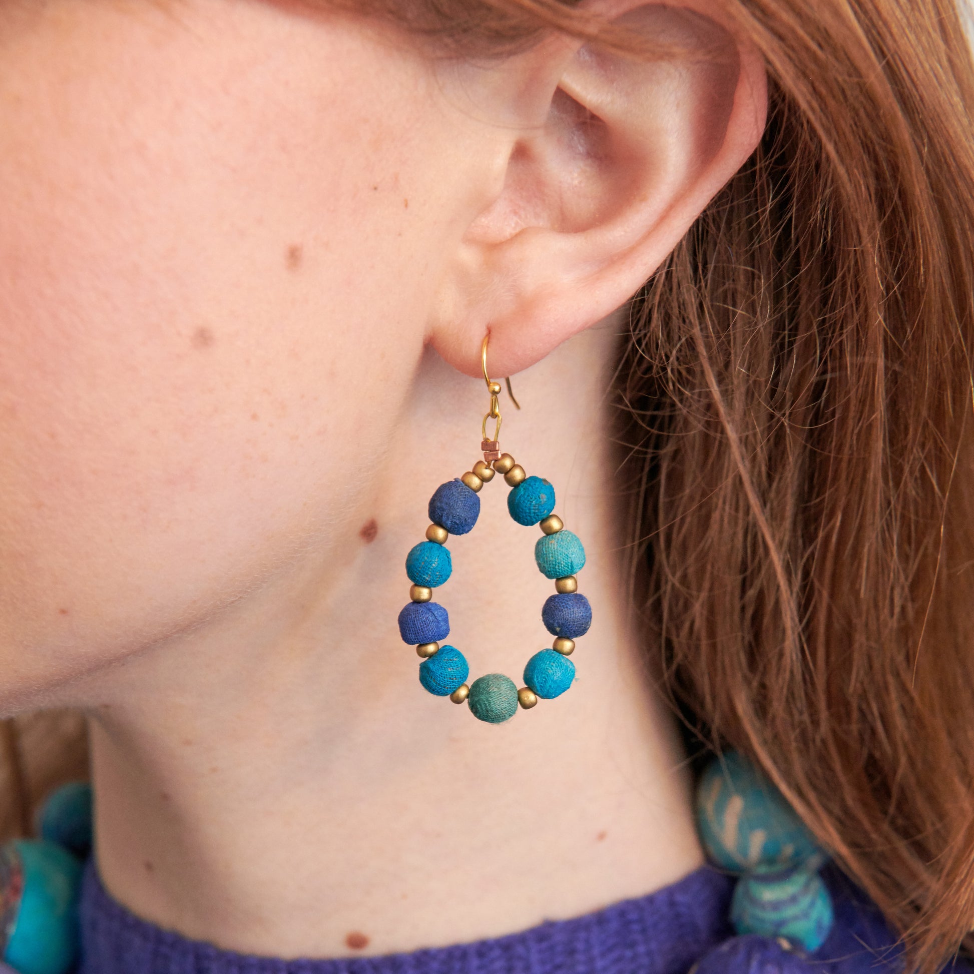 Your favorite teardrop earring style has been reimagined in shades of blue! Tiny fabric beads crafted from upcycled Kantha & Sari textiles alternate with tiny golden beads on a teardrop-shaped wire.