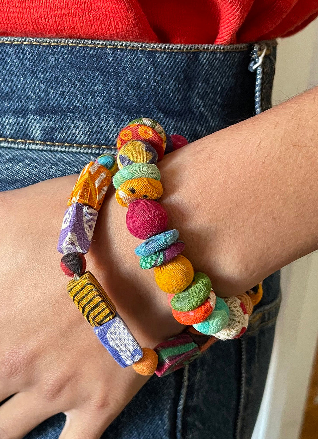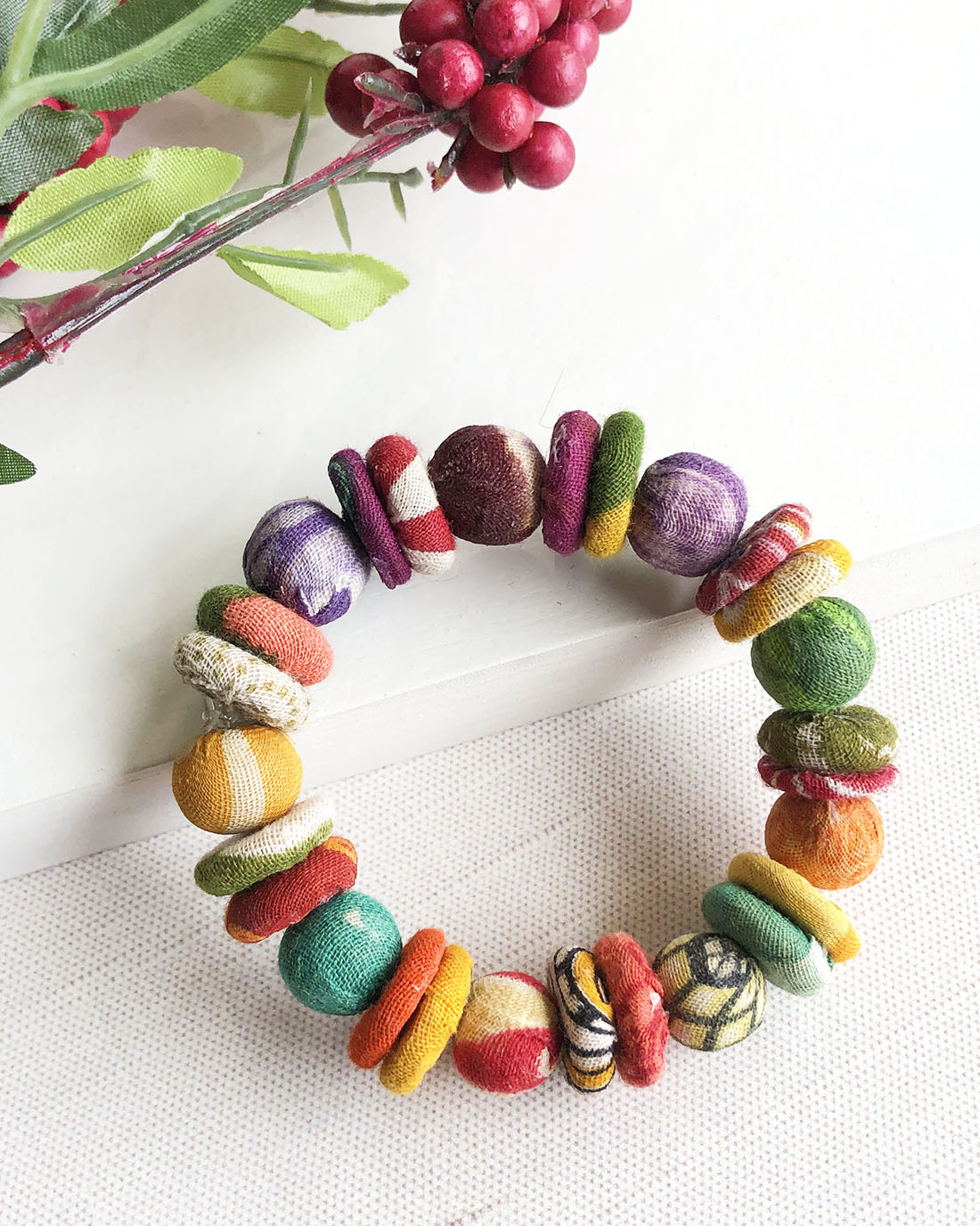 Disc-shaped Kantha 'button' beads are paired and alternate with traditional round Kantha beads for a colorful grouping of shapes and textures.