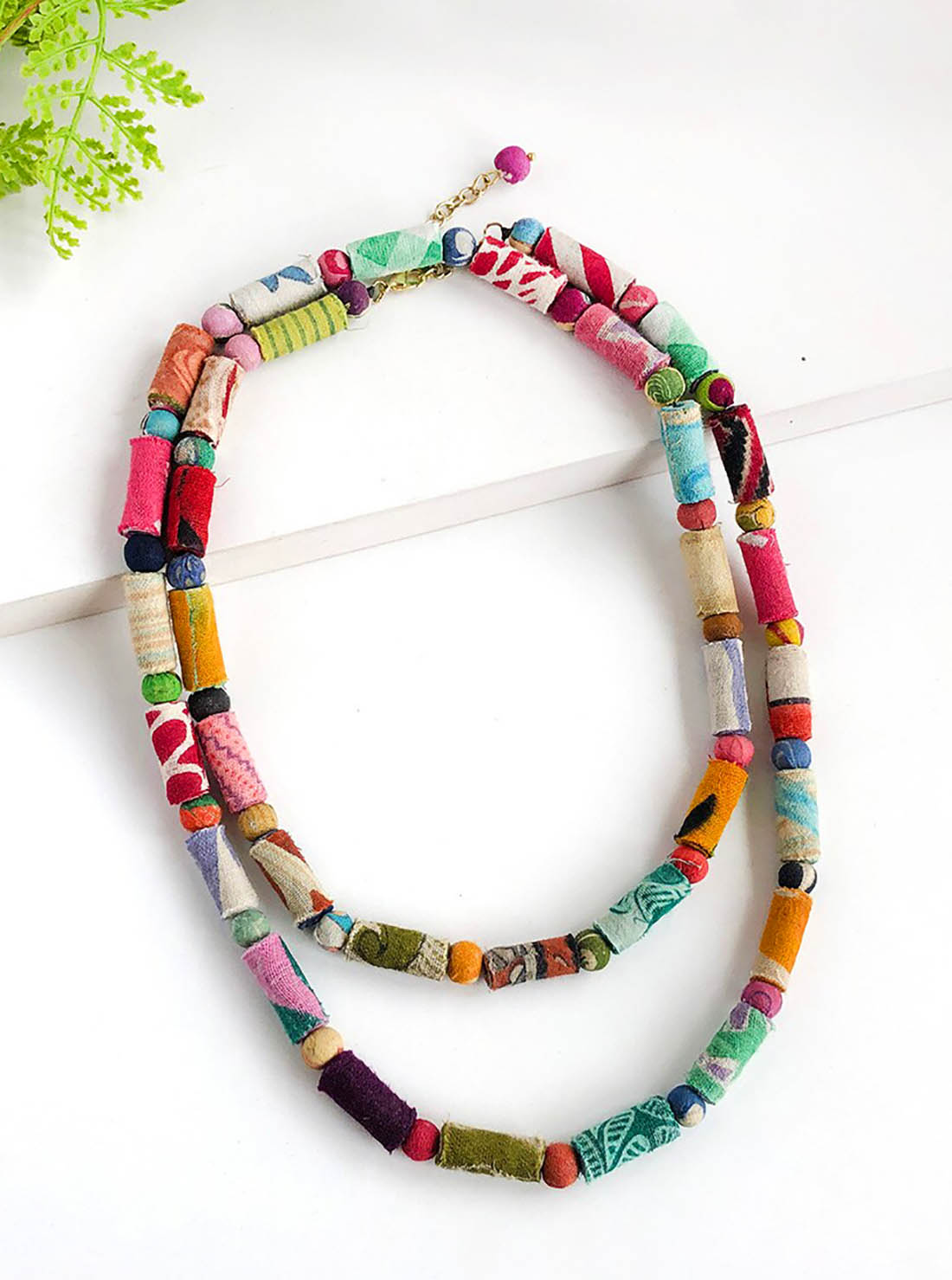 Each piece is made from upcycled Kantha textiles, so colors and patterns are all one-of-a-kind and will vary. Measures 38″ long with a 3″ extender. Sustainably handmade by women artisans in India.