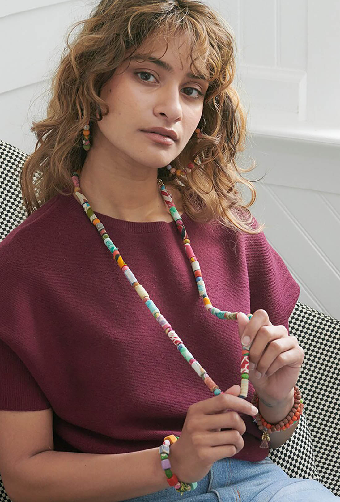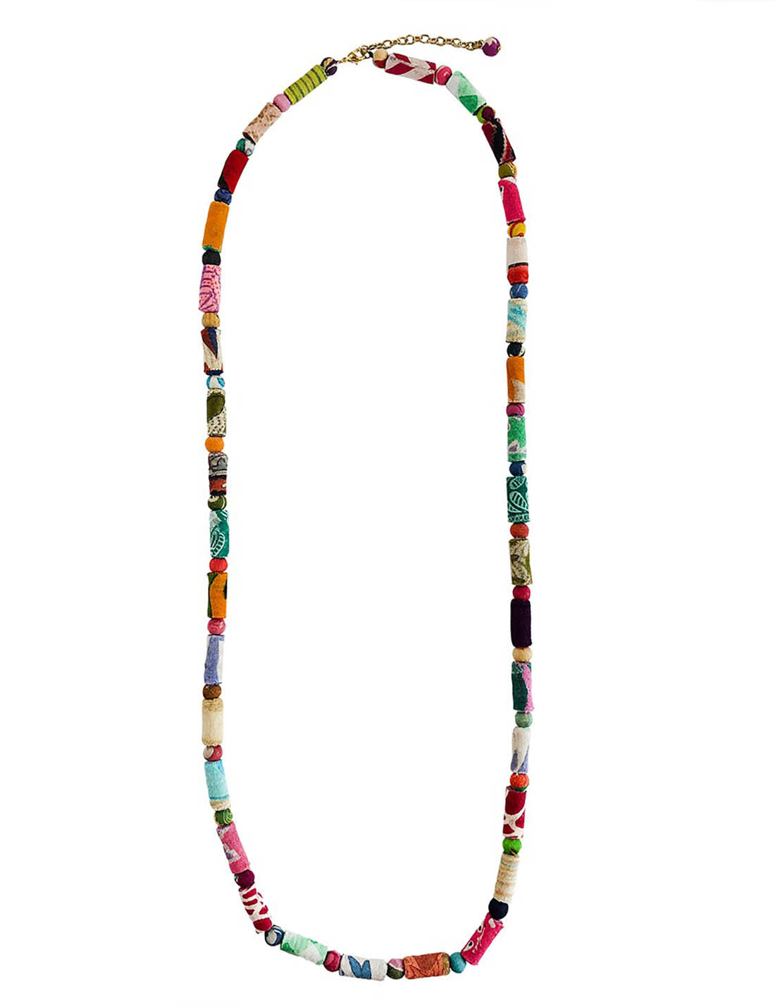 Round and tubular-shaped Kantha beads alternate to create this colorful, geometric style. This long strand is super versatile and can be worn singly, doubled or multi-wrapped as a bracelet.