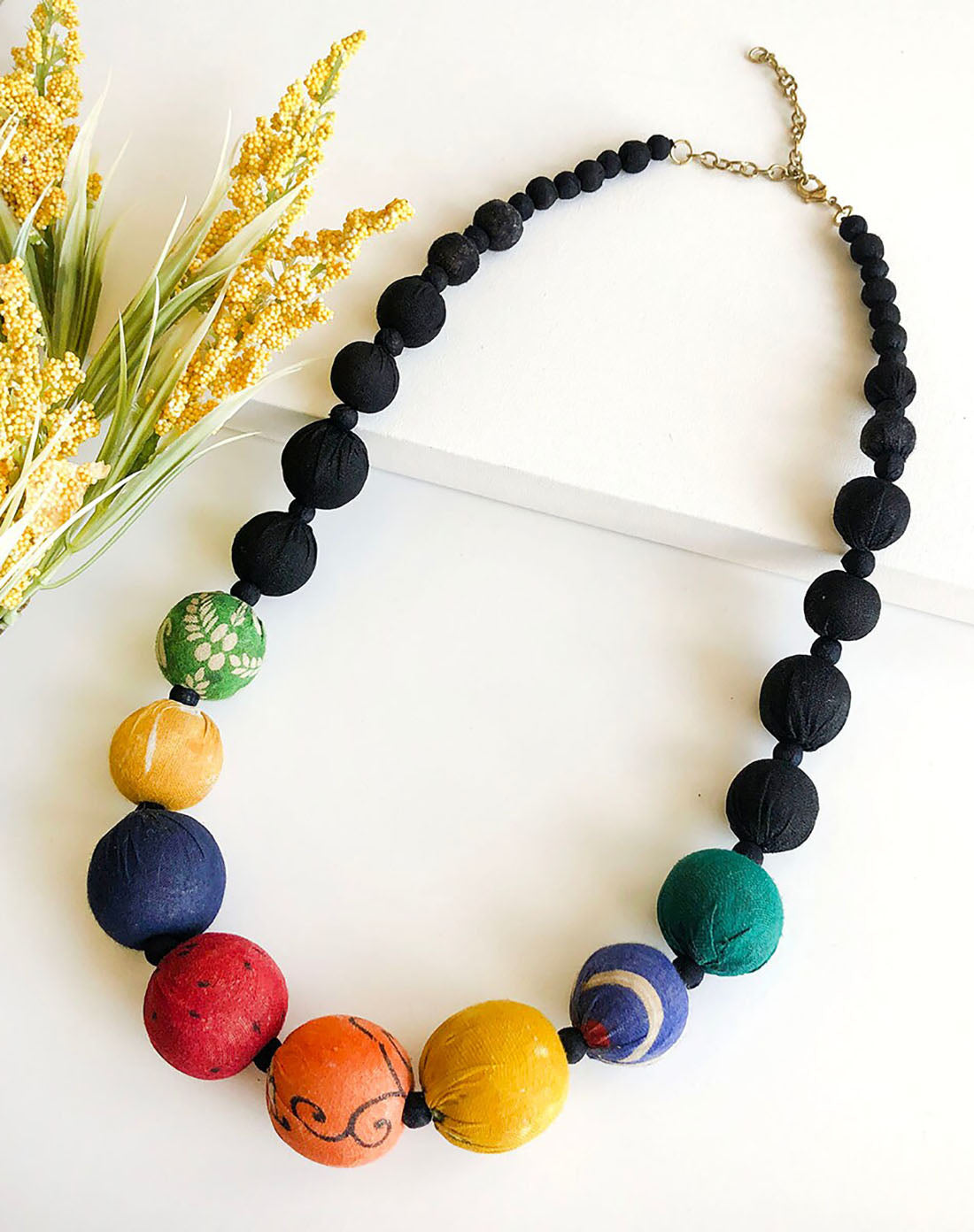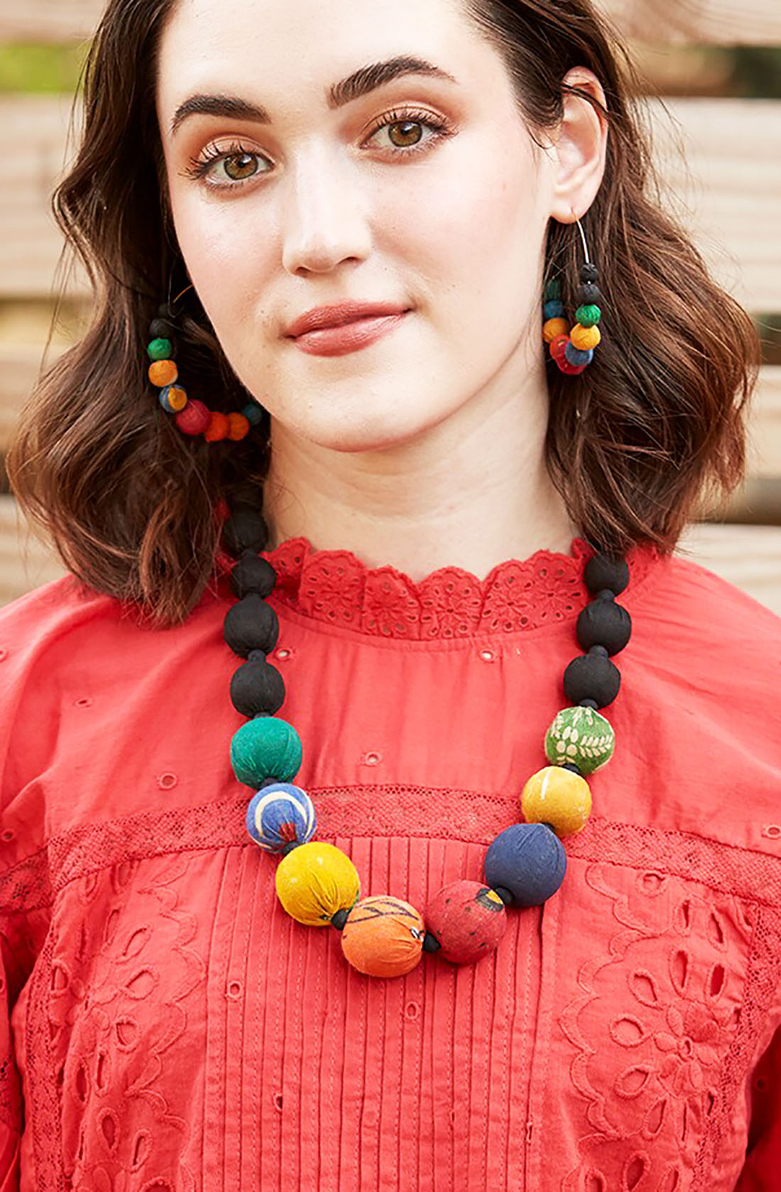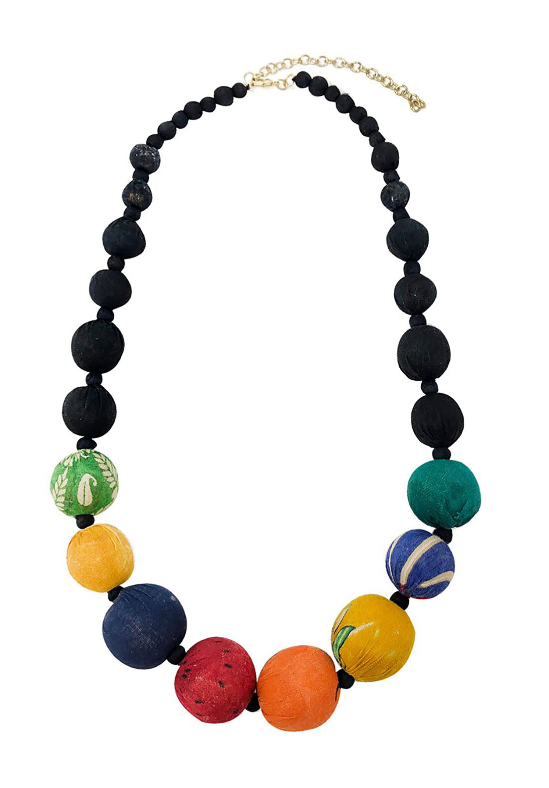 A constellation of colorful repurposed Kantha beads brightens up a background of black beads, representative of the night sky.