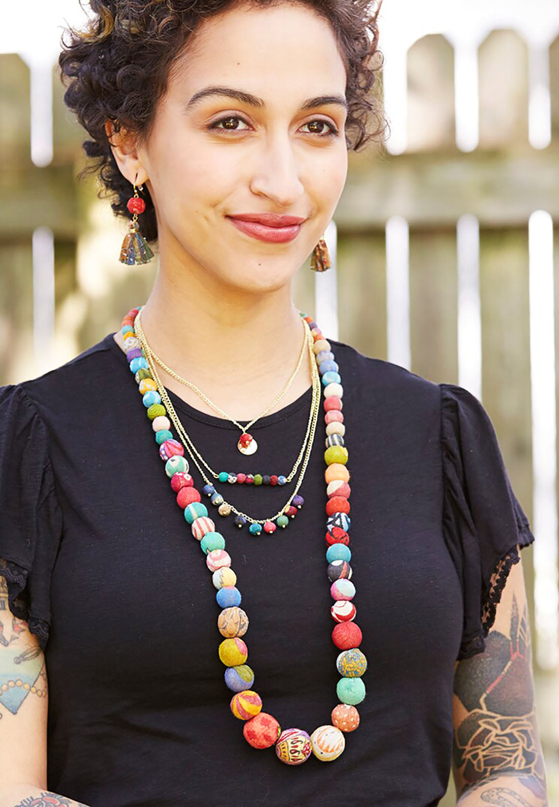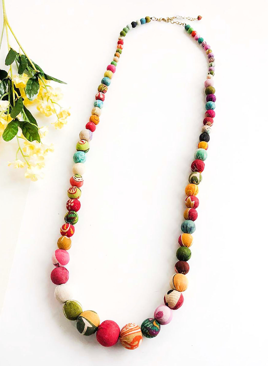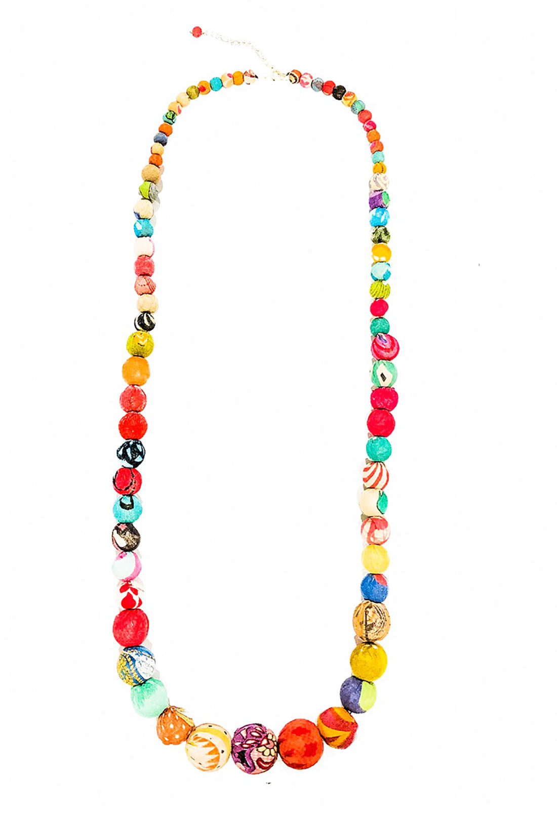 A long strand of colorful, round Kantha beads gradually increases as it reaches the center. Looks great alone or layered.