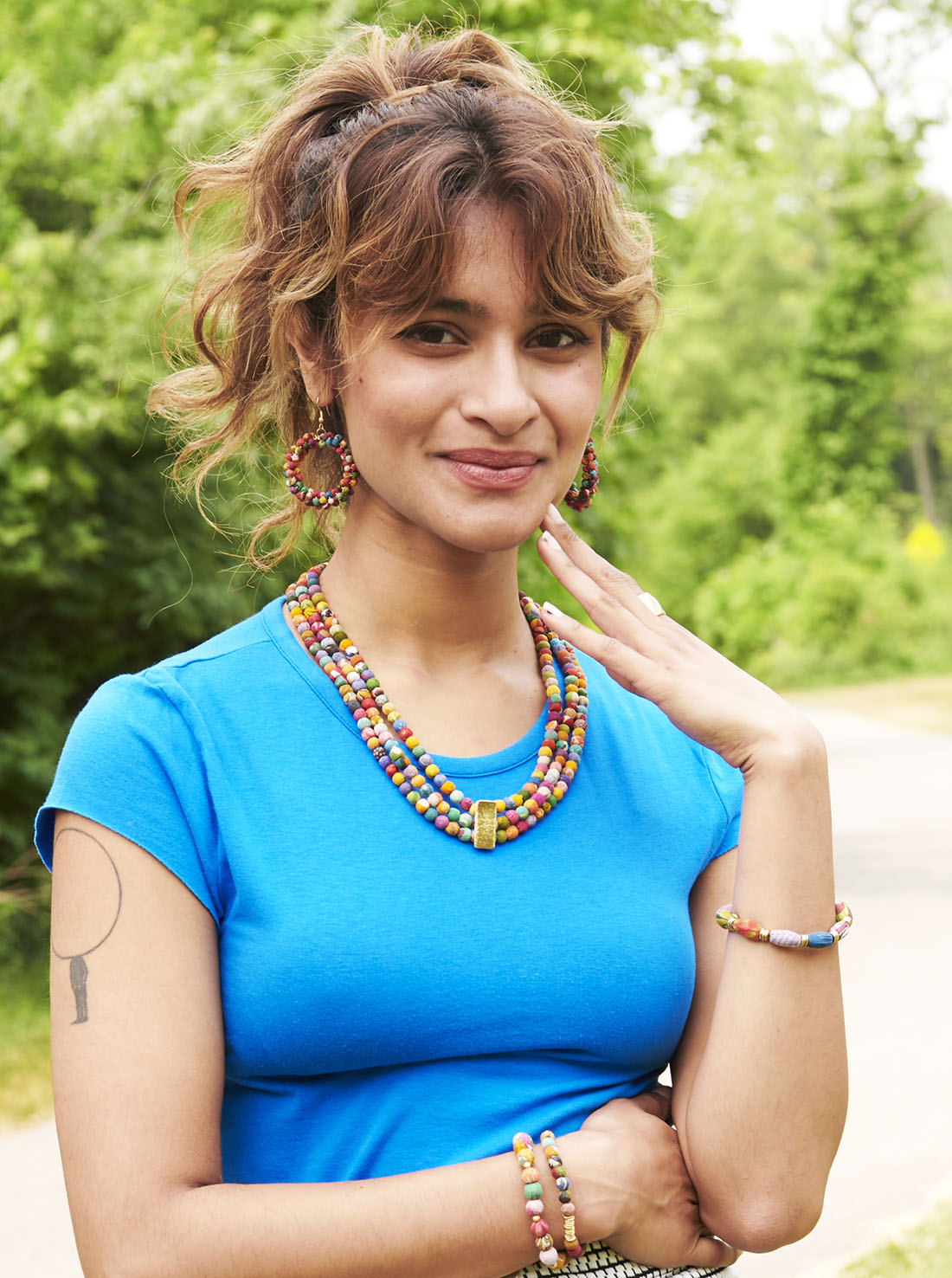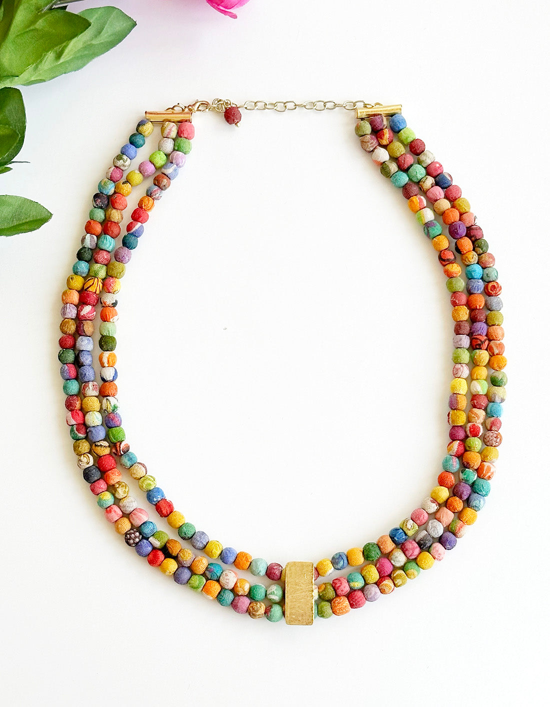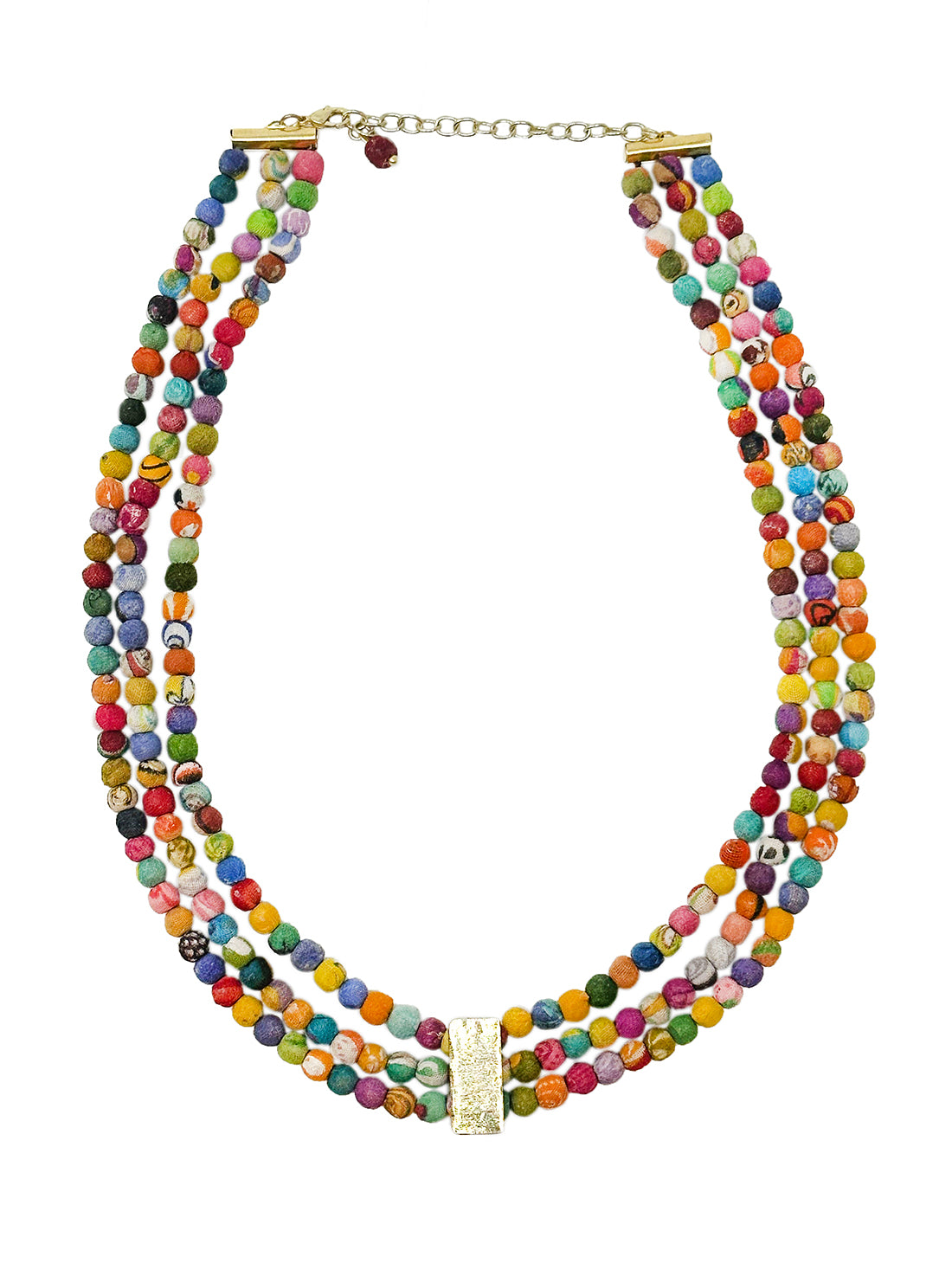 Crafted from repurposed Sari and Kantha fabric, the colorful beads measure approximately 18.5” long + a 3” extender chain.