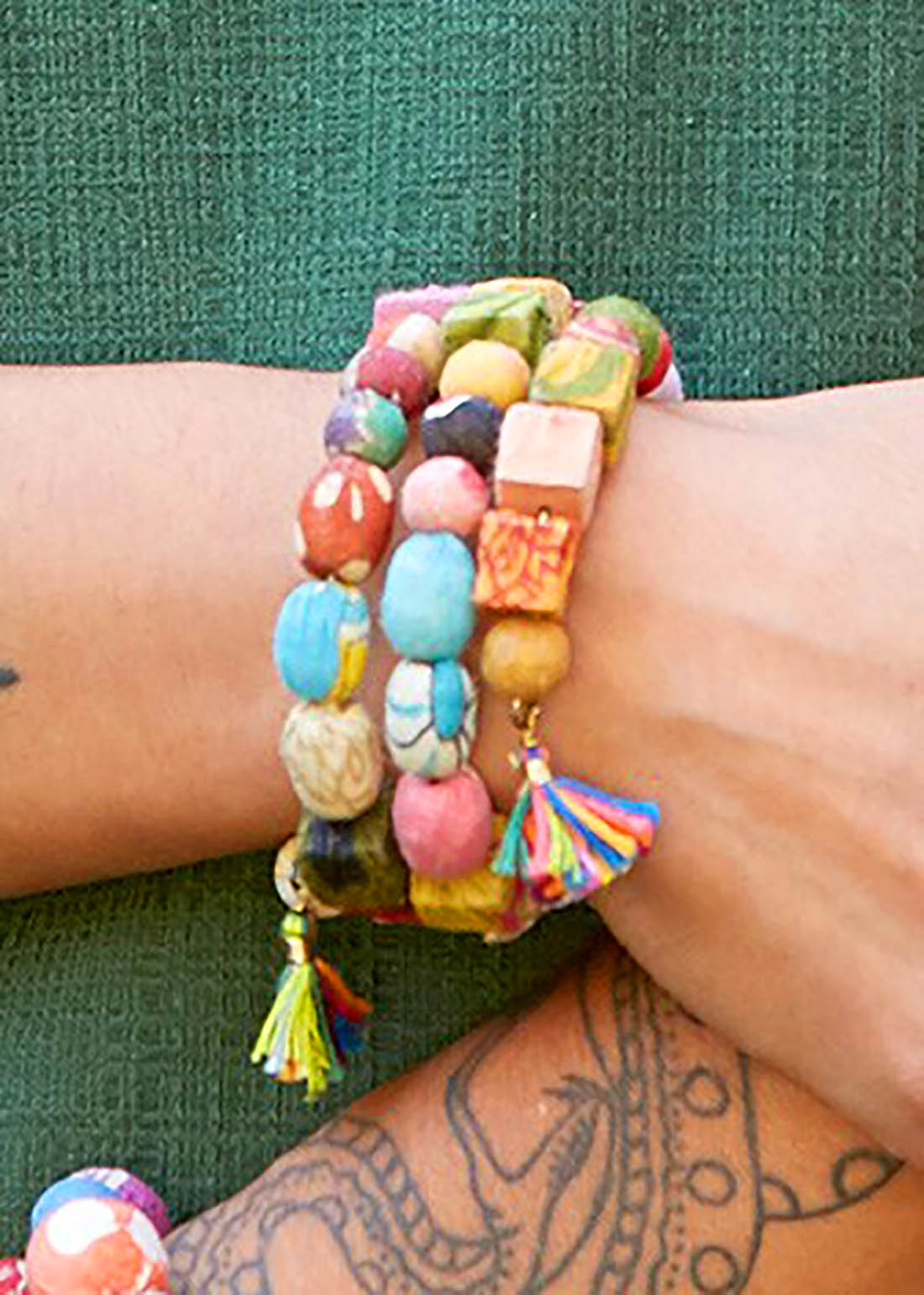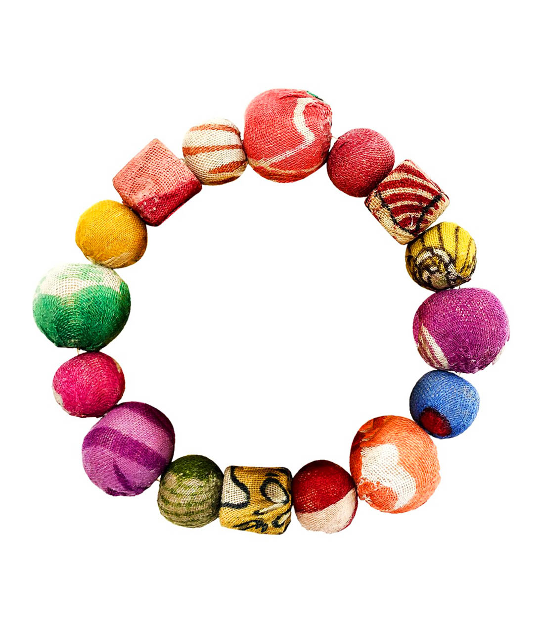 A fun, colorful mix of round and square Kantha beads form this stretchy strand. Colors and patterns will vary as this is made from repurposed textiles.