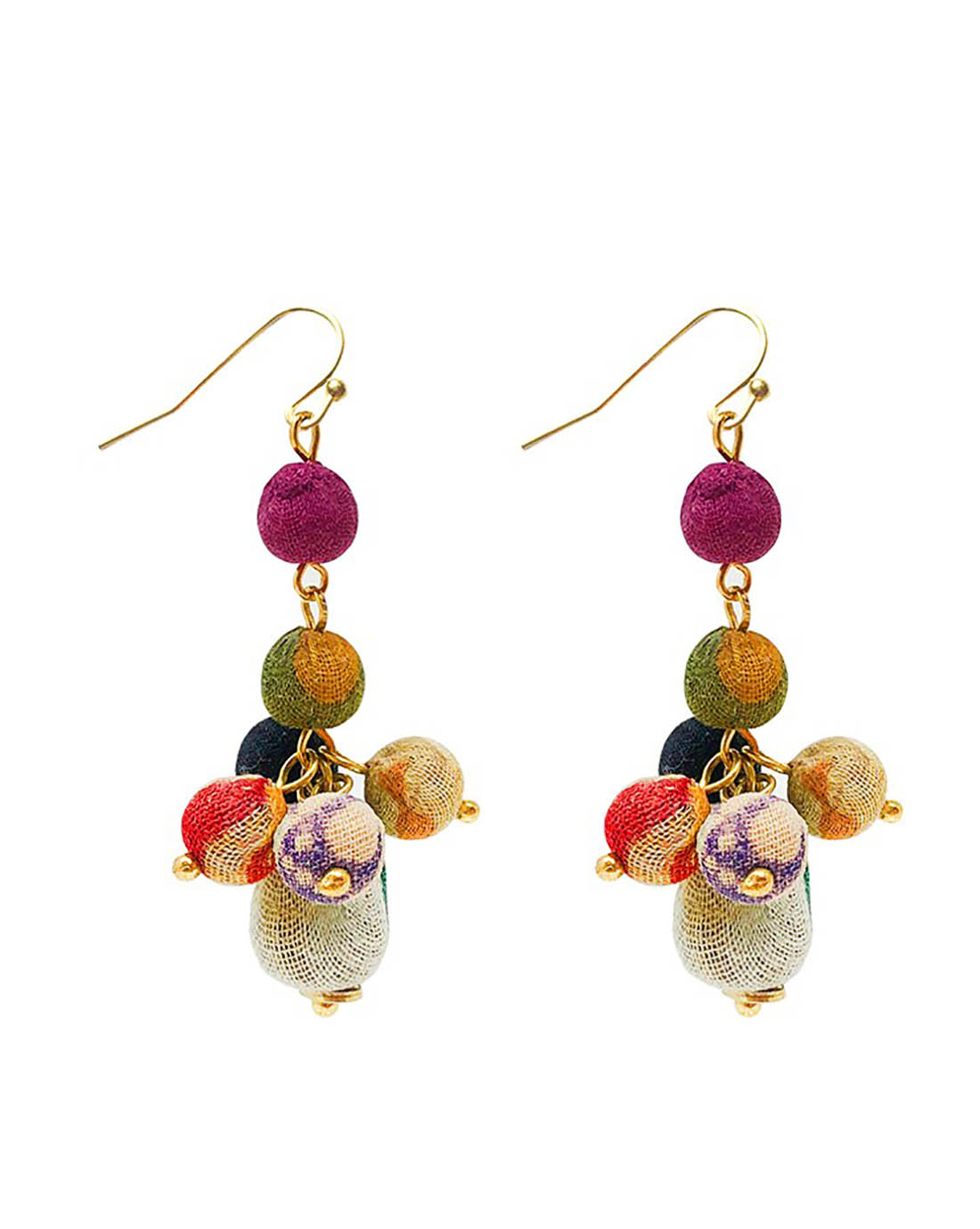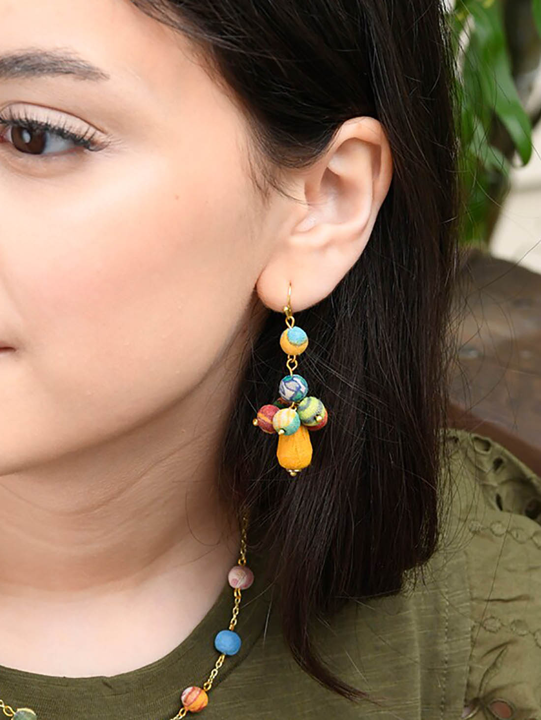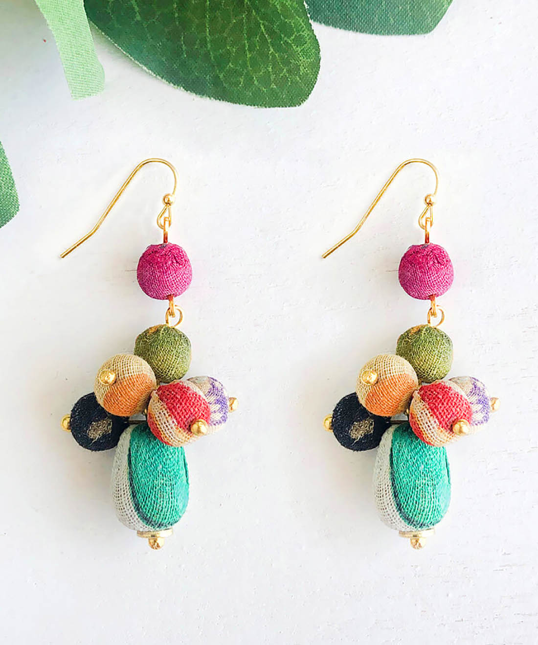 Packed with personality, these dimensional drop earrings are handmade from a tiered arrangement of Kantha beads. Each is made from repurposed fabric covering a wood base, so colors and patterns will vary.