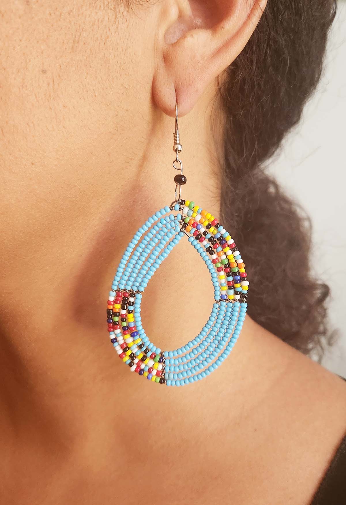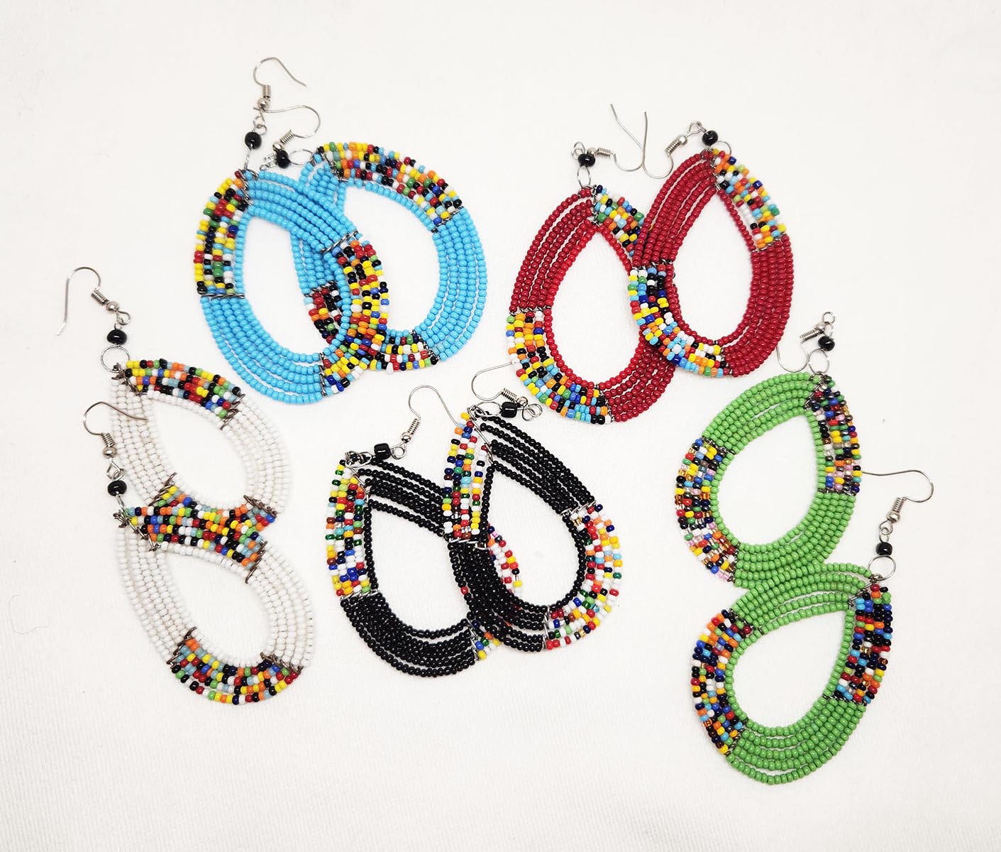 Beautiful handmade beaded earrings from Kenya. Each color is highlighted by a band of multi-colored beads. 2.5"