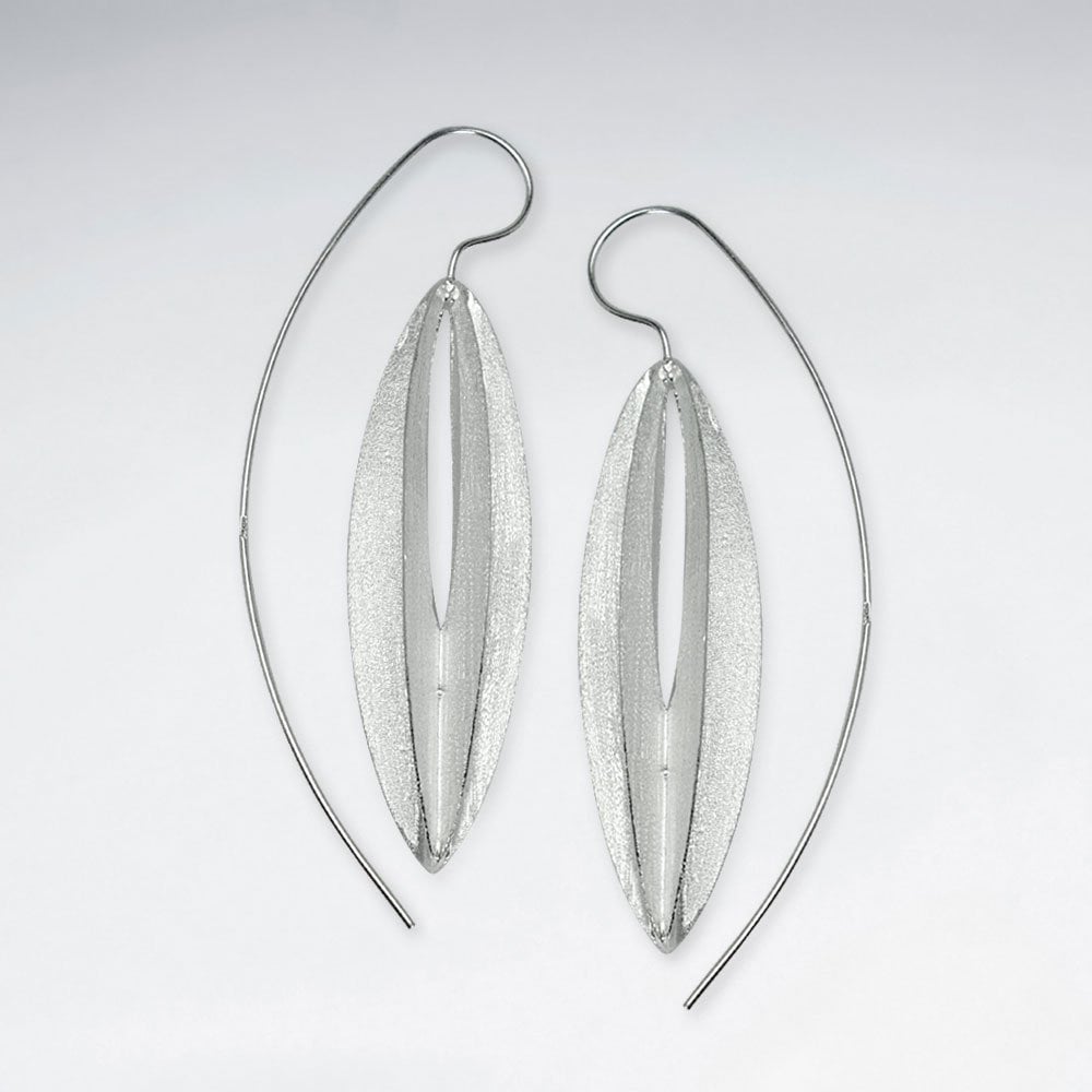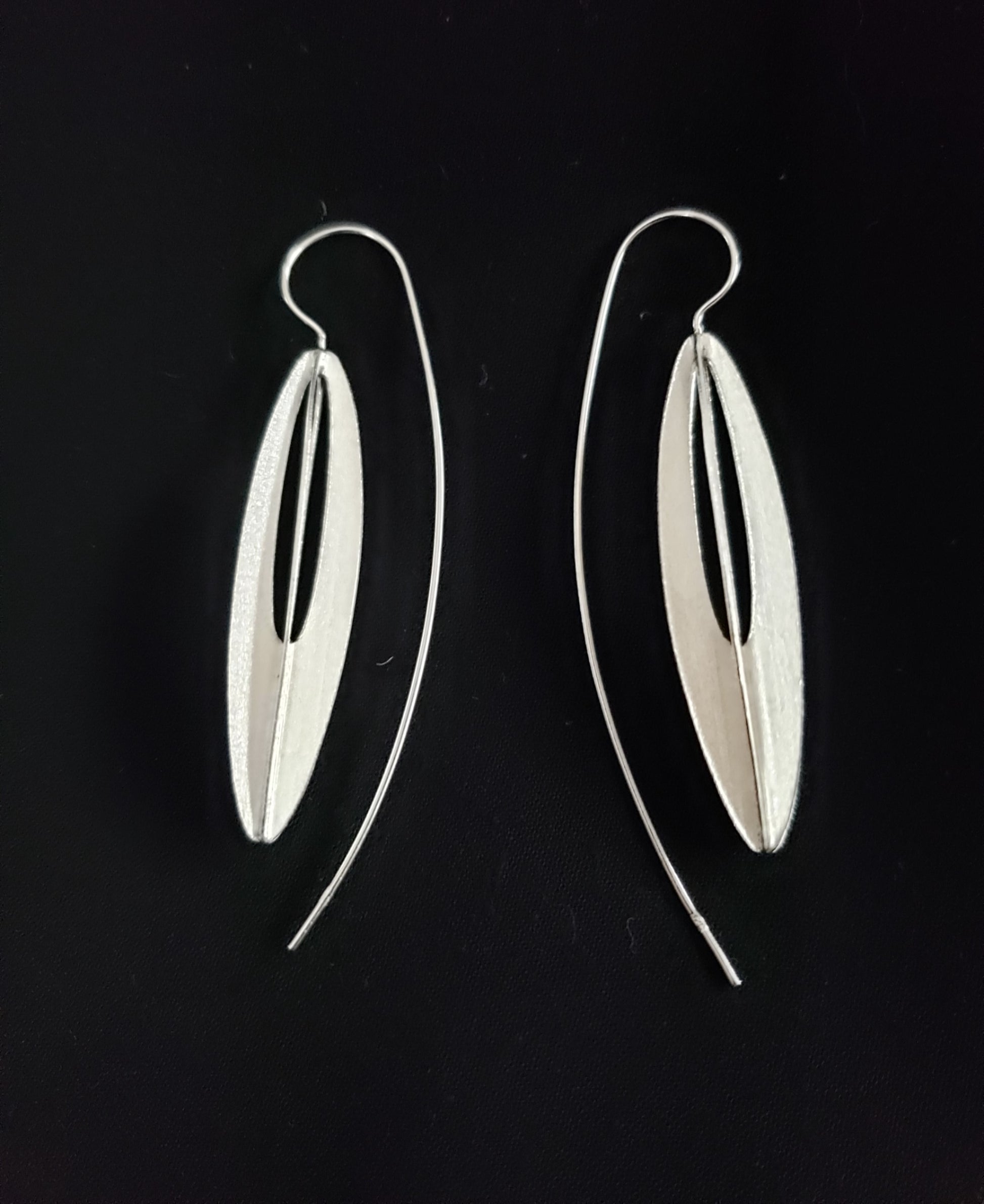 Each delicate oval is made of 6 slender strips of sterling silver to form an opening in the center. These are very unique earrings that hang 1 3/4 inches from the ear. They also have a very sophisticated textured matte finish. Made in Thailand.
