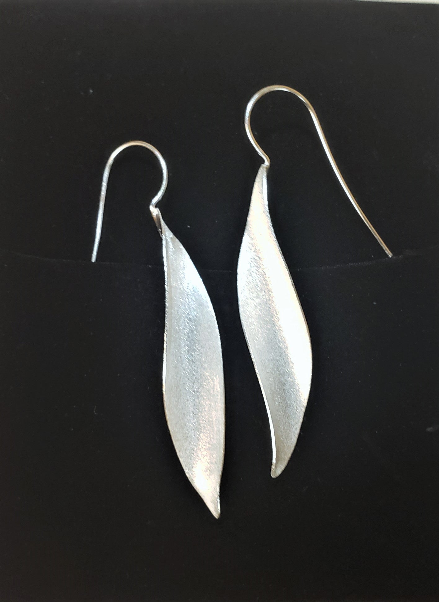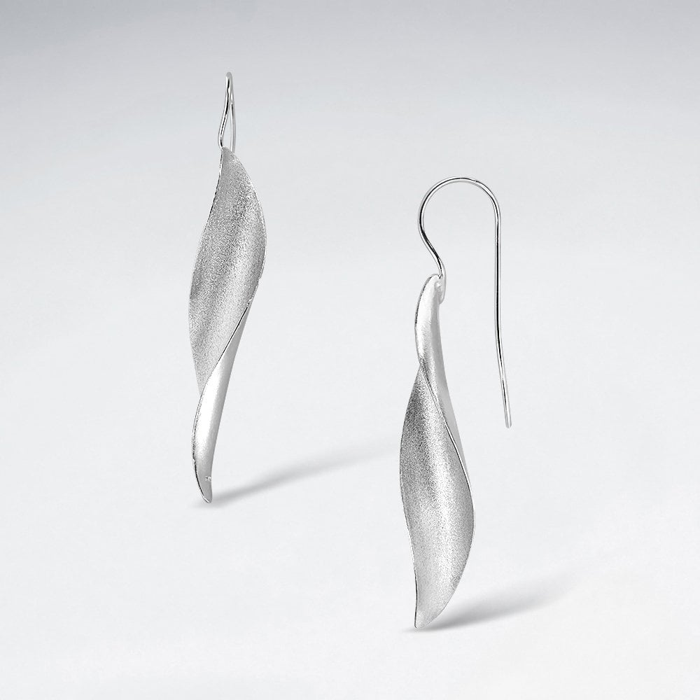 Sterling silver earrings in a slender leaf with brushed texture finish. 2" Thailand