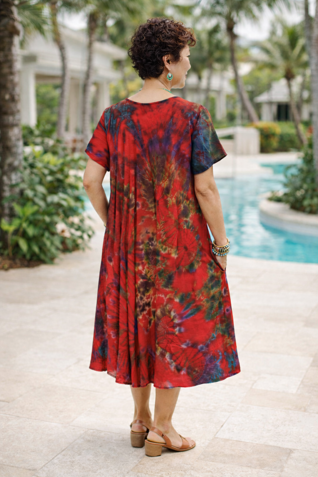 Turn heads in this vibrant tie-dye dress that's as fun as it is functional. The bias-cut design creates a graceful drape that flatters every figure, while hidden pockets let you carry what matters without compromising style. Cap sleeves add a flirty finishing touch to this color-popping essential. Wear it bold, wear it proud—this dress is ready for whatever adventure comes next.