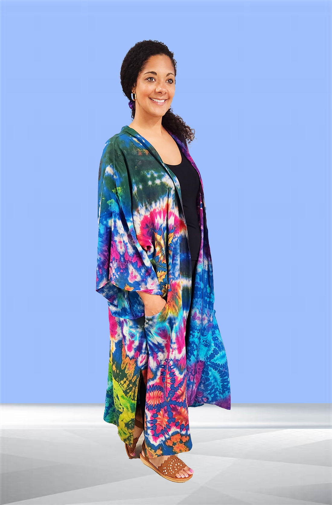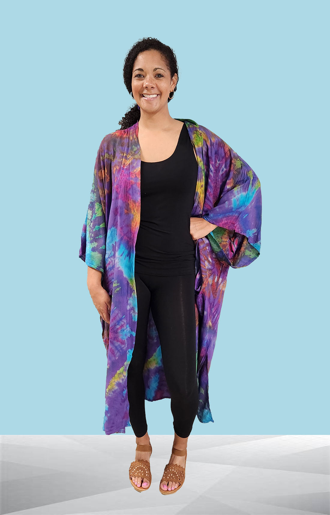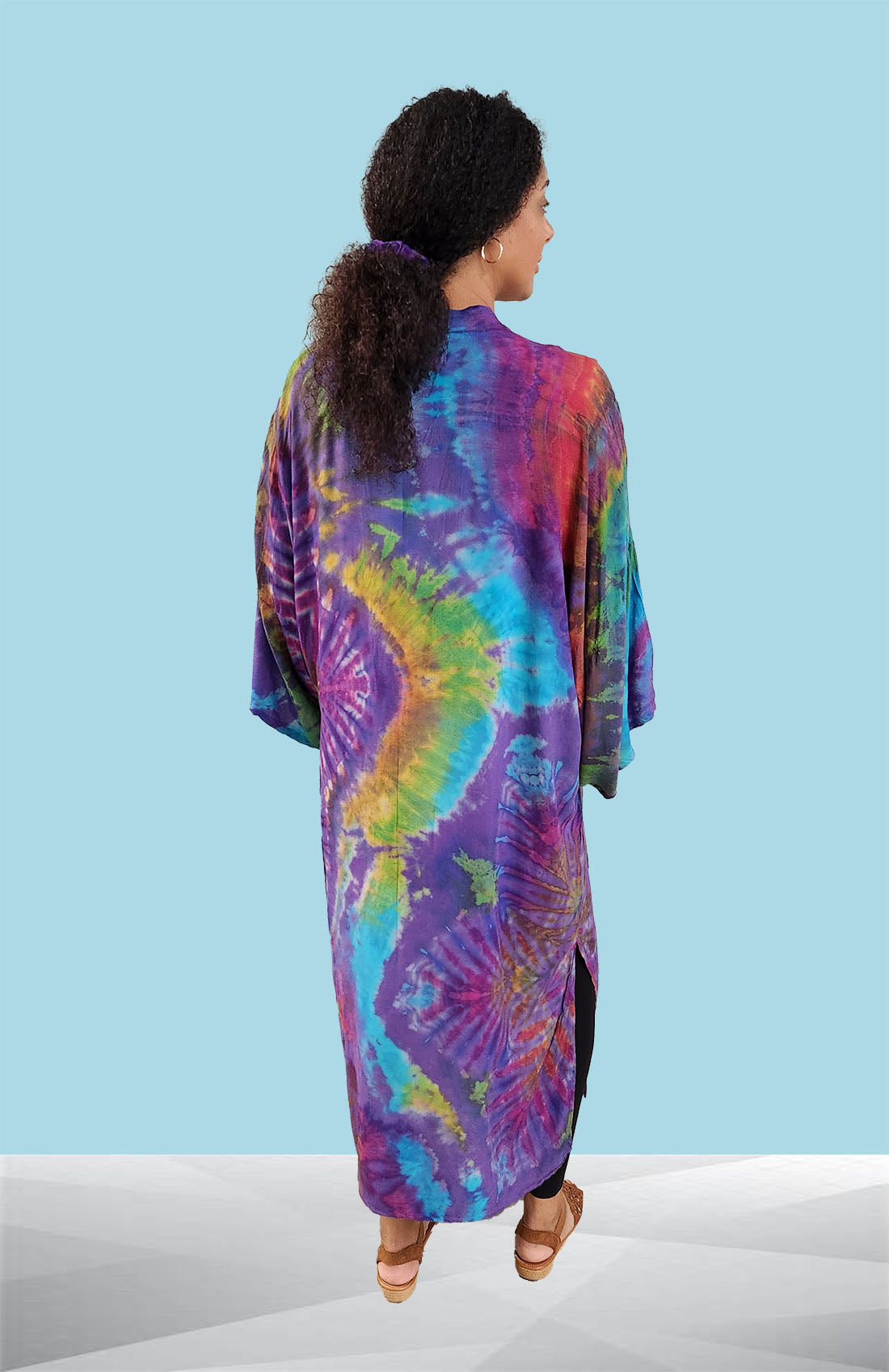 This one-size duster offers a chic, bohemian touch with its long, flowy design and loose-fitting silhouette. It drapes elegantly over the body, creating an effortless, oversized look. The open-front kimono cardigan features roomy sleeves and an eye-catching tie-dye design that exudes a relaxed, beachy vibe.