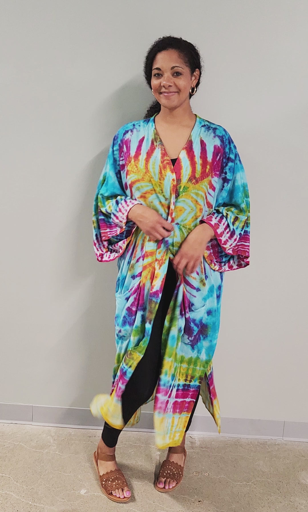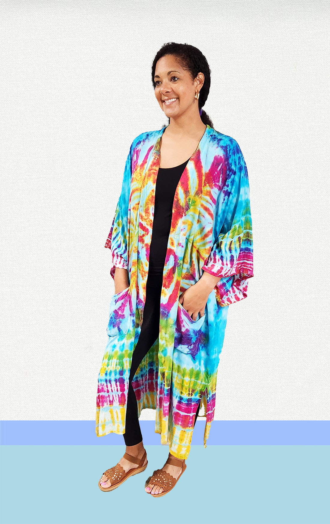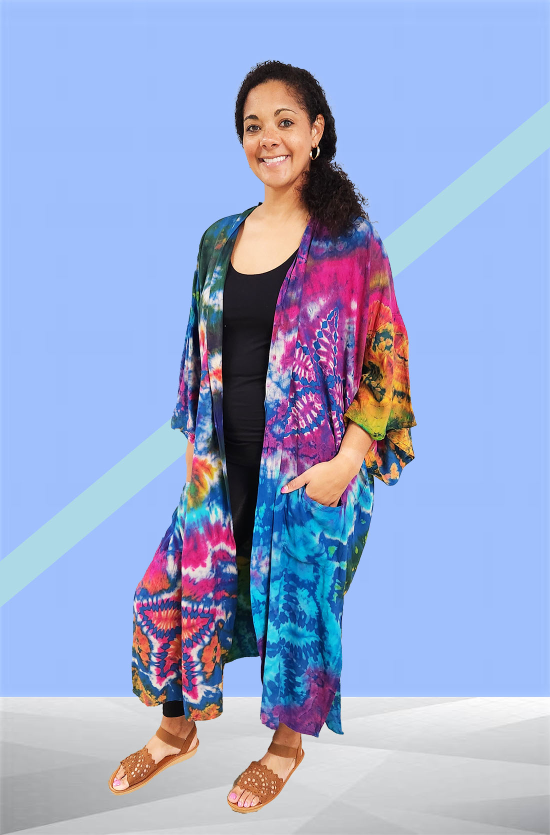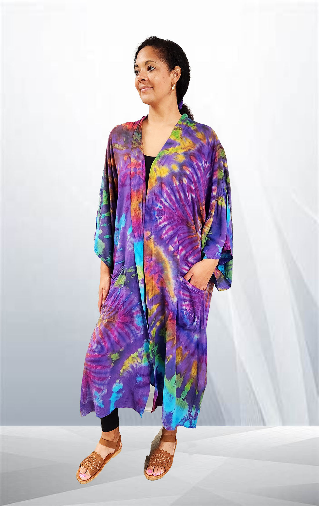 This one-size duster offers a chic, bohemian touch with its long, flowy design and loose-fitting silhouette. It drapes elegantly over the body, creating an effortless, oversized look. The open-front kimono cardigan features roomy sleeves and an eye-catching tie-dye design that exudes a relaxed, beachy vibe.