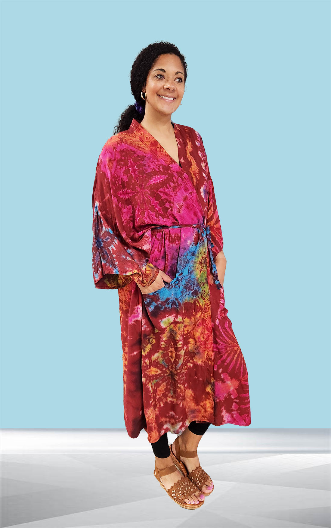 This generous design is perfect for plus size ladies. It also comes with a sash and has two pockets for those little essentials. Each is unique. If you're looking for a dominant color, use the comments in your order.