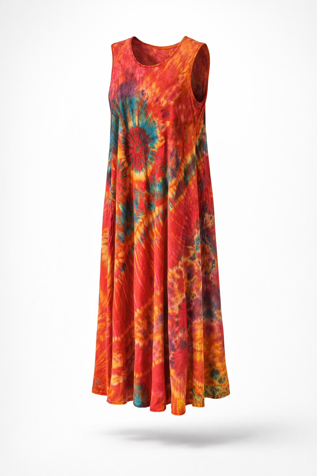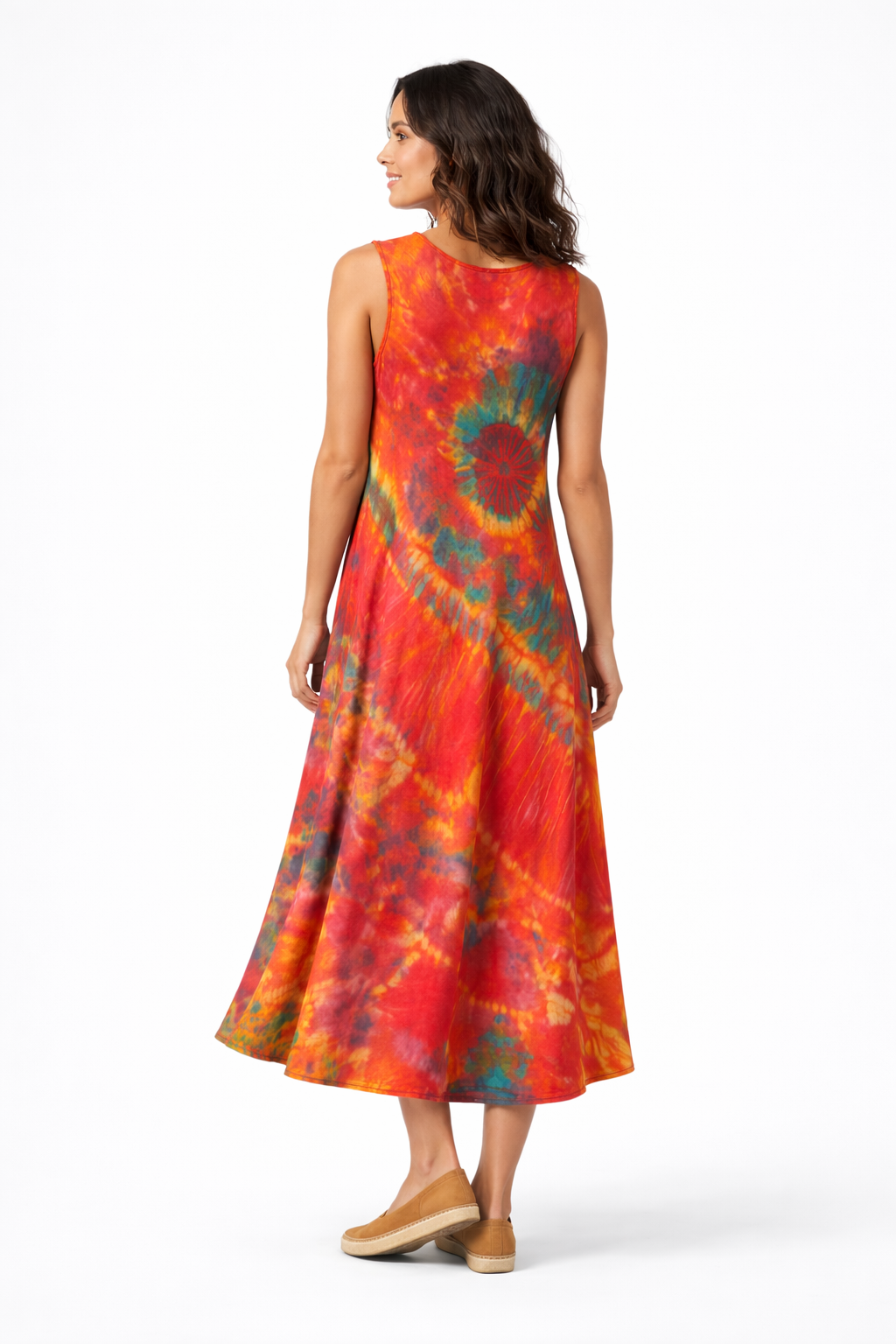 Tie Dye Sleeveless Long Dress w/Pockets - Red