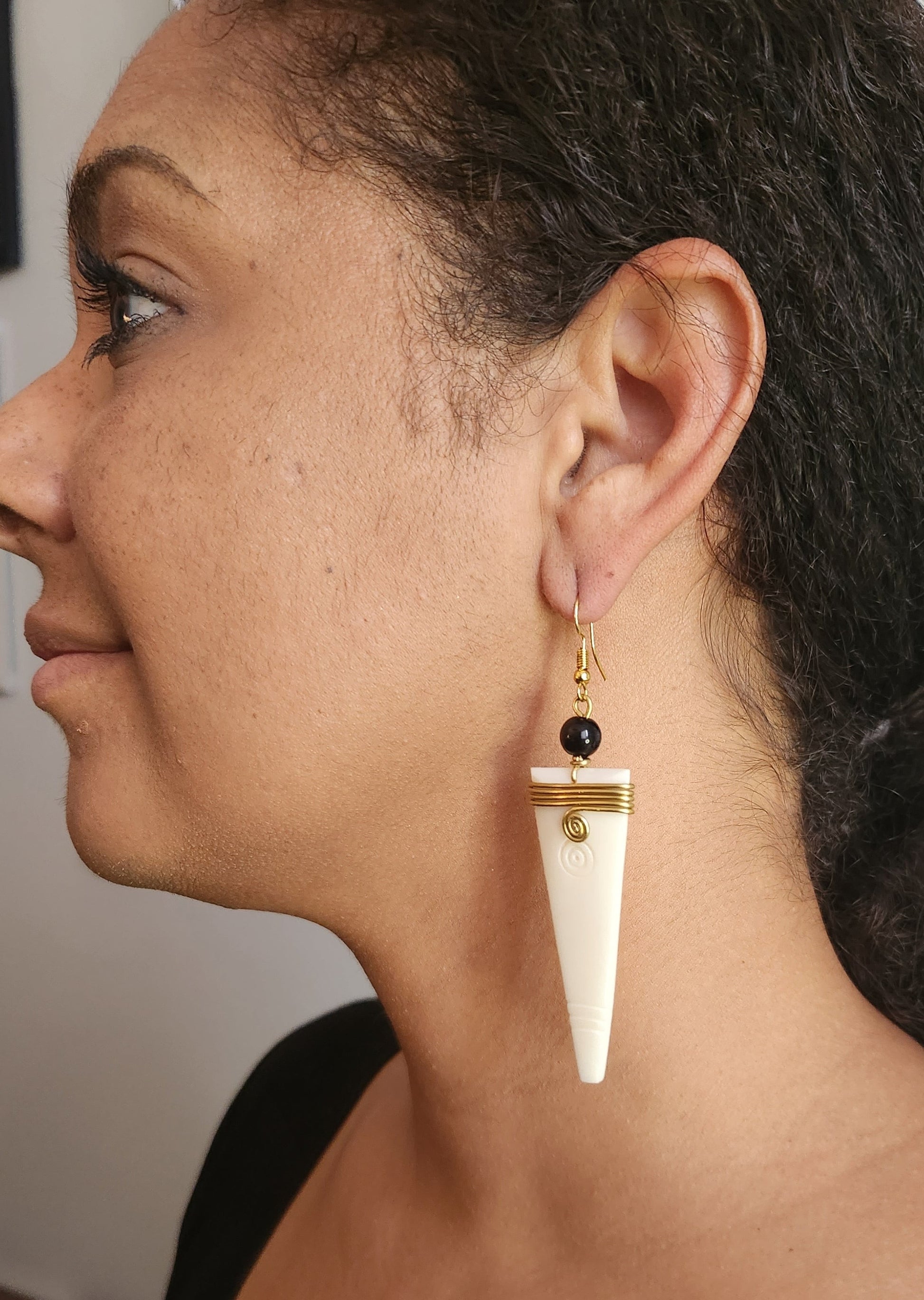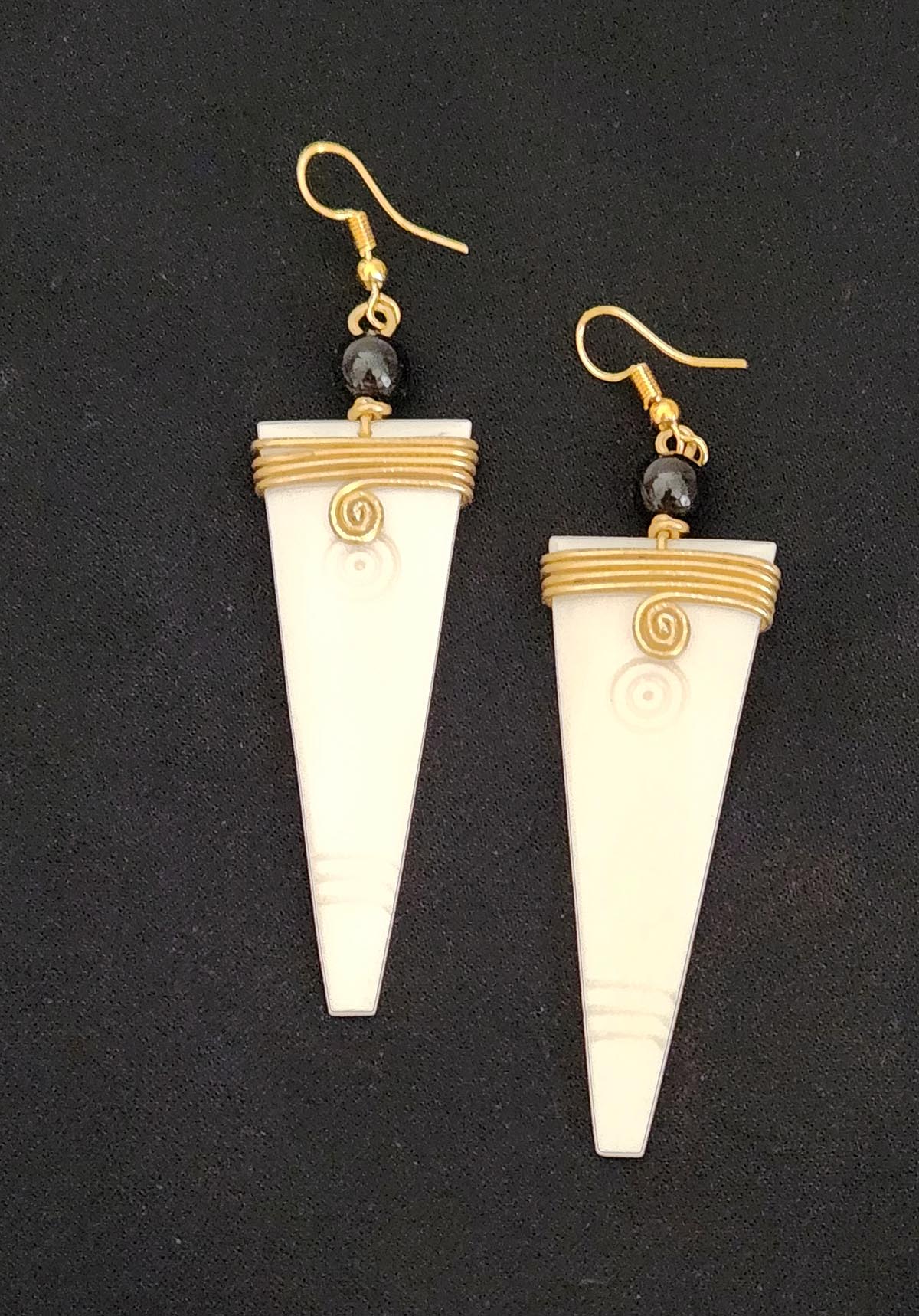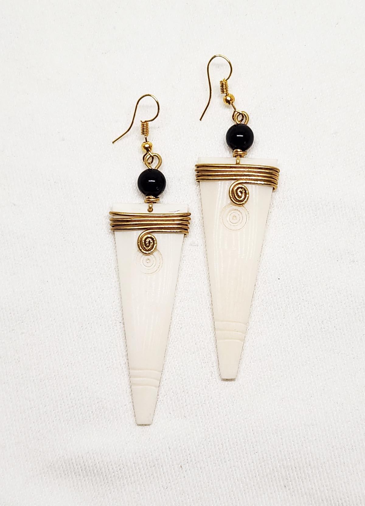Sophisticated and stylish, these White Bone Swirl Arrowhead Earrings are brass with a black bead and feature a white bone arrowhead that is wrapped in a coil of brass with a spiral of brass hanging from the coil. Made in Kenya. J-E180
